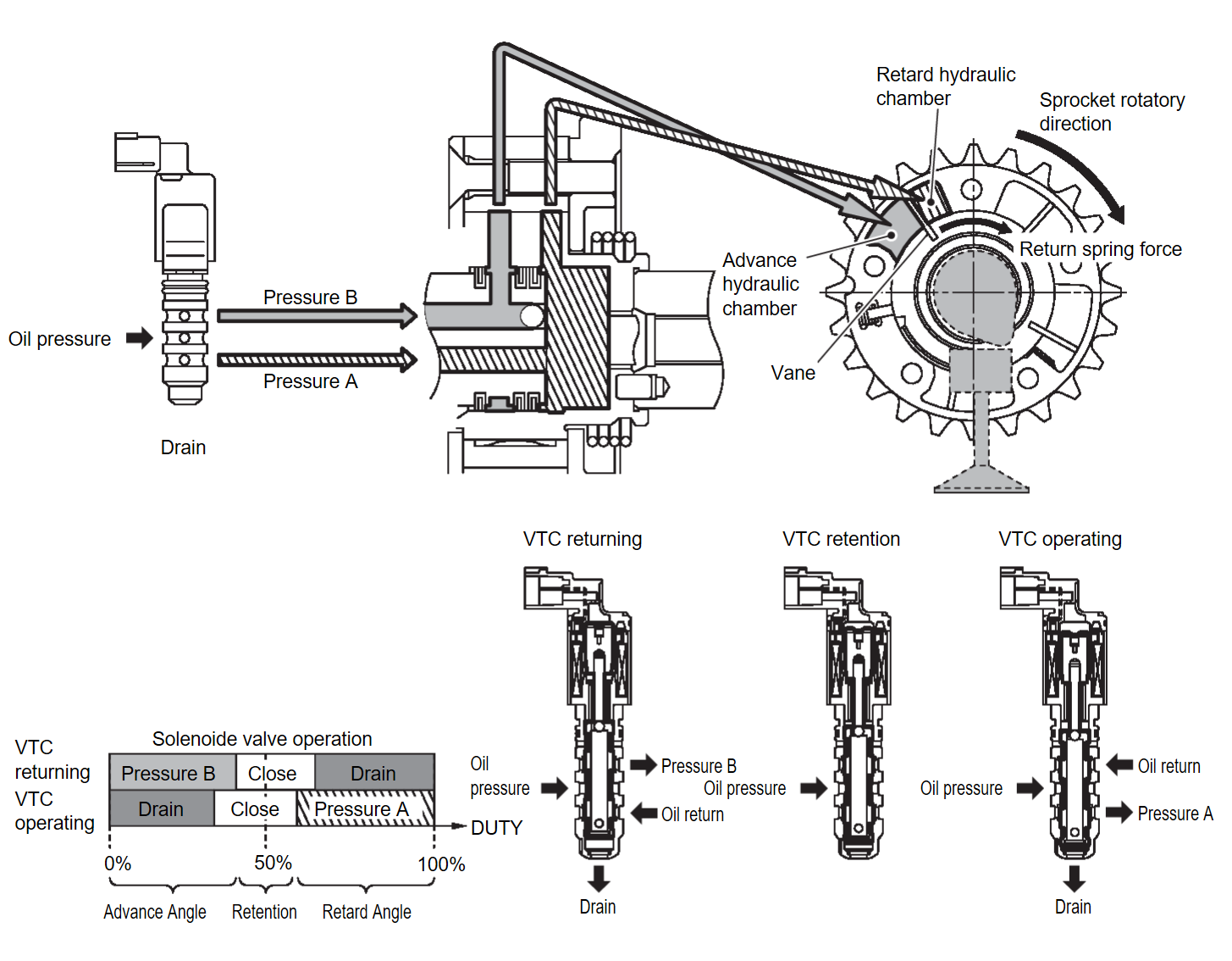 | Neutral (Maintained) | When it is the target valve timing, the energization rate to the control solenoid valve is adjusted to the intermediate state. The solenoid valve is positioned at the neutral position and the oil path is interrupted to maintain the cam shaft phase. |
