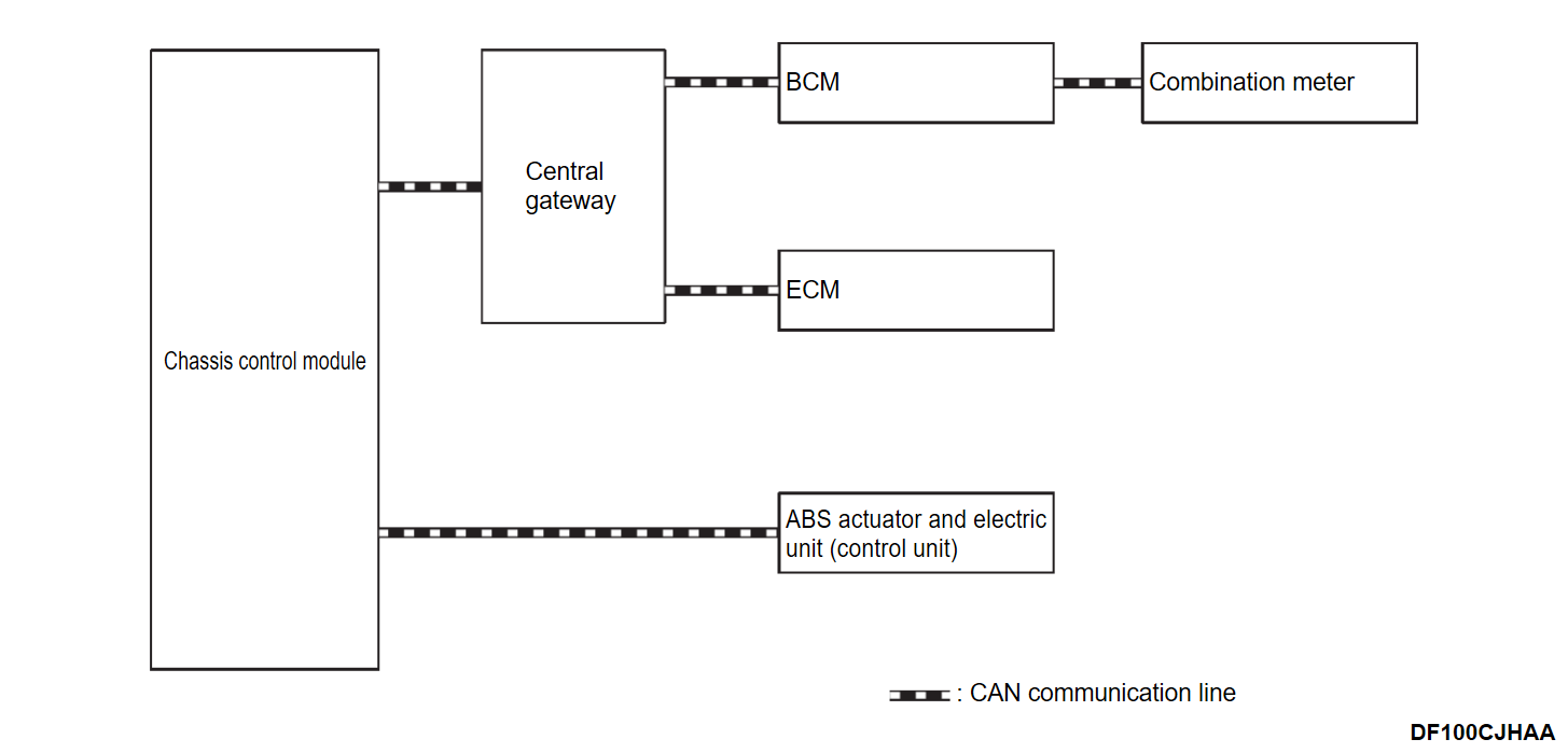 | ABS actuator and electric unit (control unit) | Mainly transmits the following signals to chassis control module via CAN communication.- Front LH wheel speed signal