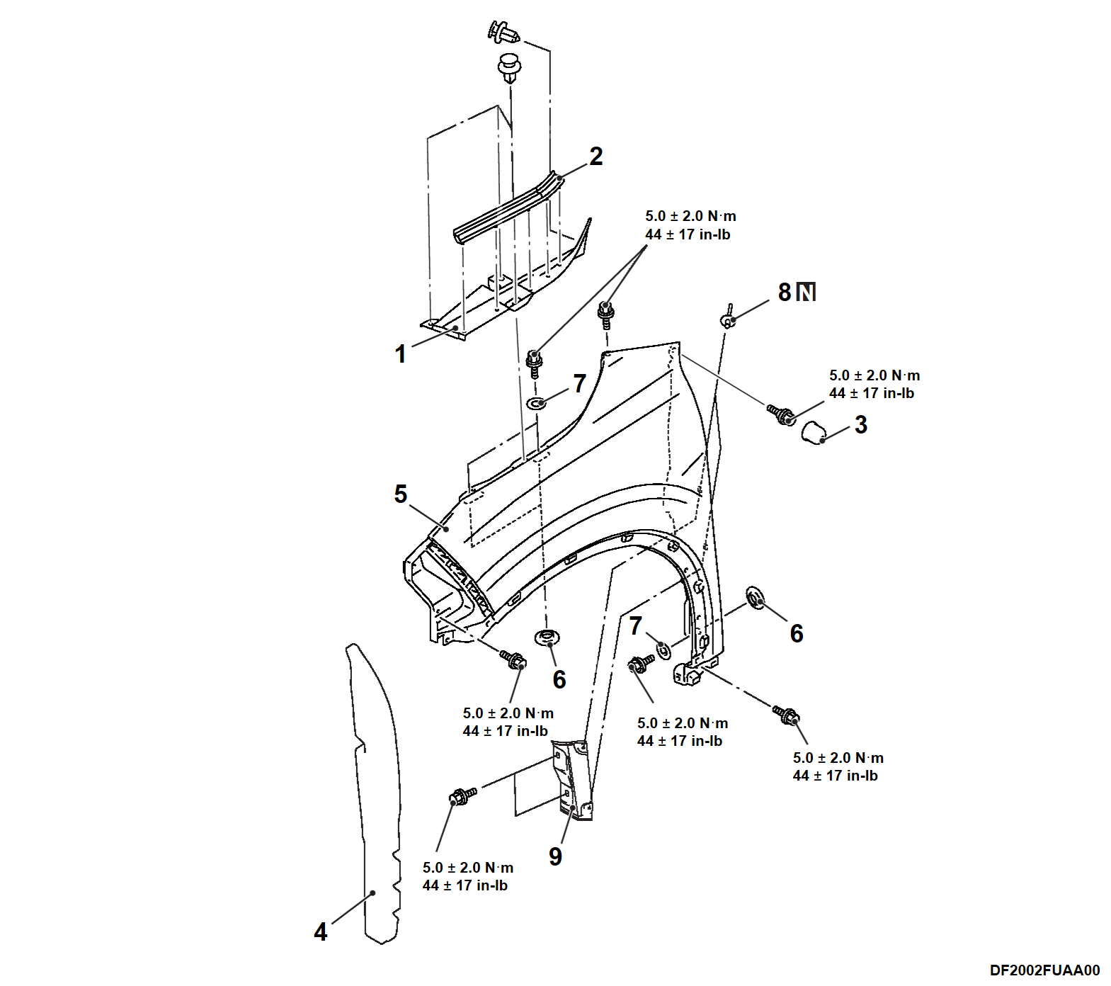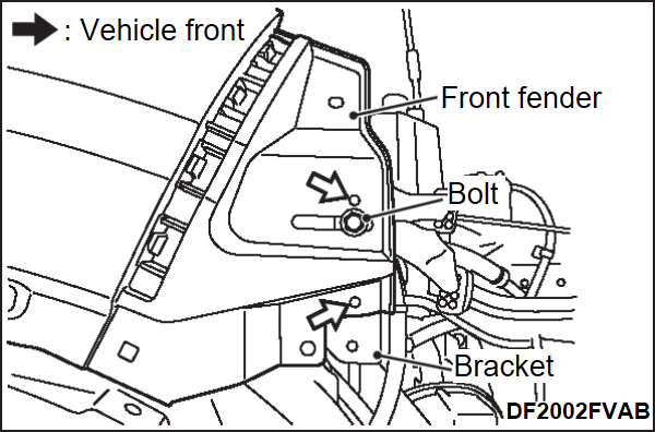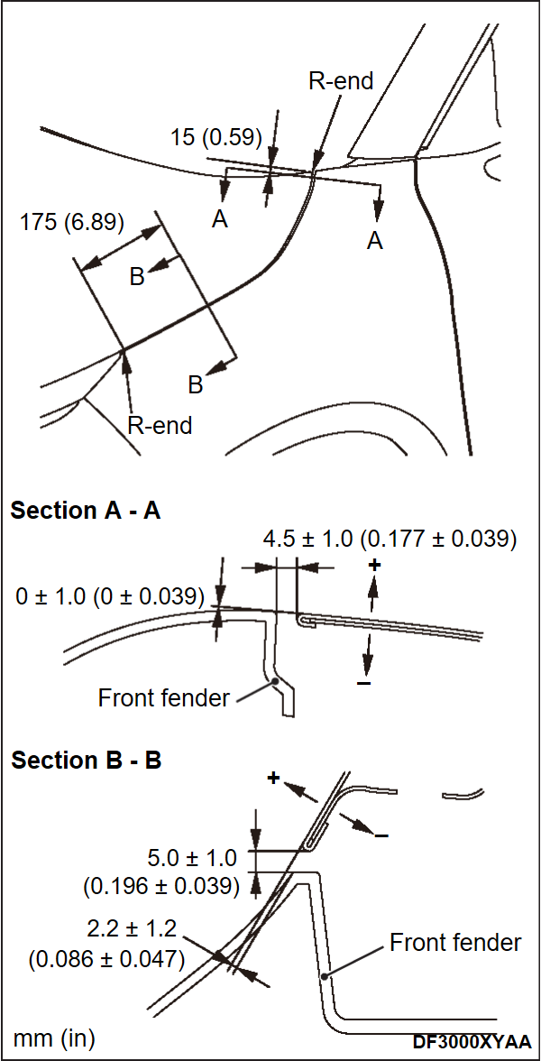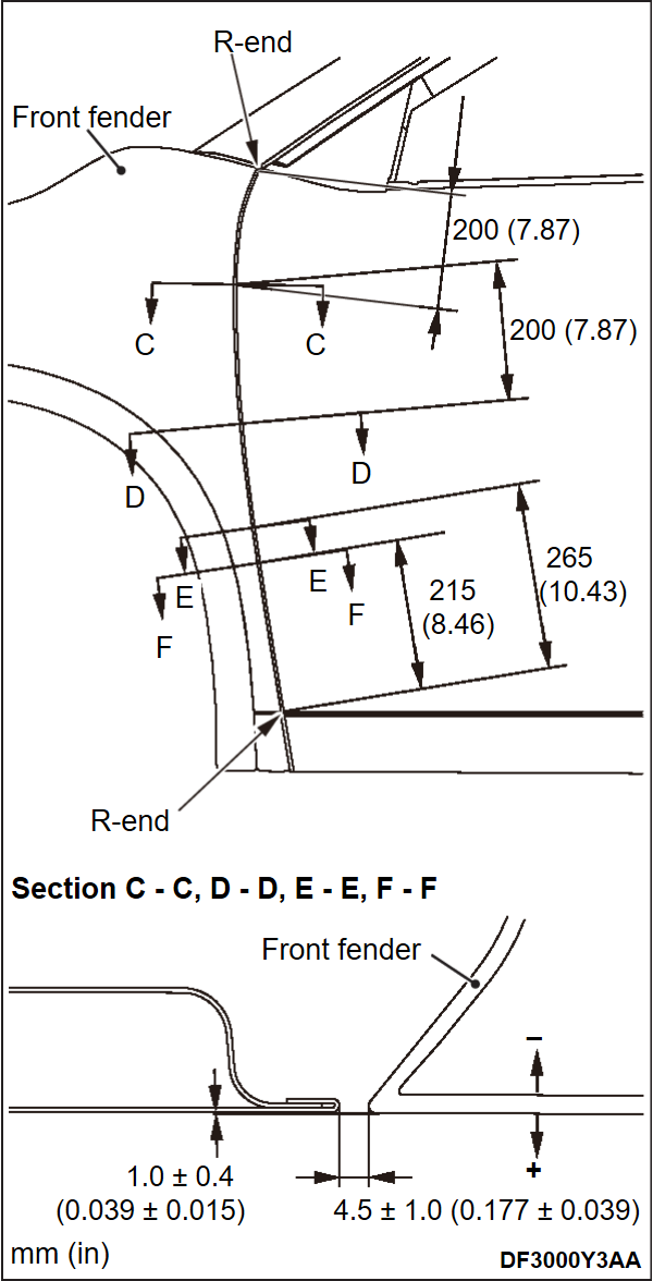 2. Install the front fender so that the gap between the hood and the front fender, and the front door and the front fender fit within the specified value shown in the illustration.