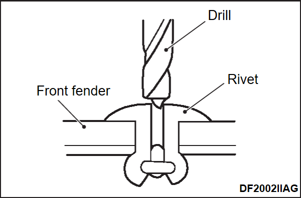 Use a drill [Φ 4.0 mm (0.16 inch)] to make a hole in the rivet to break it, and remove the rivet.