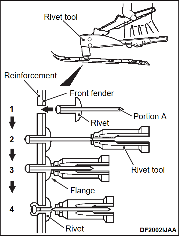 4. Thin part of portion A of the rivet will be cut off and the part is fixed in position.