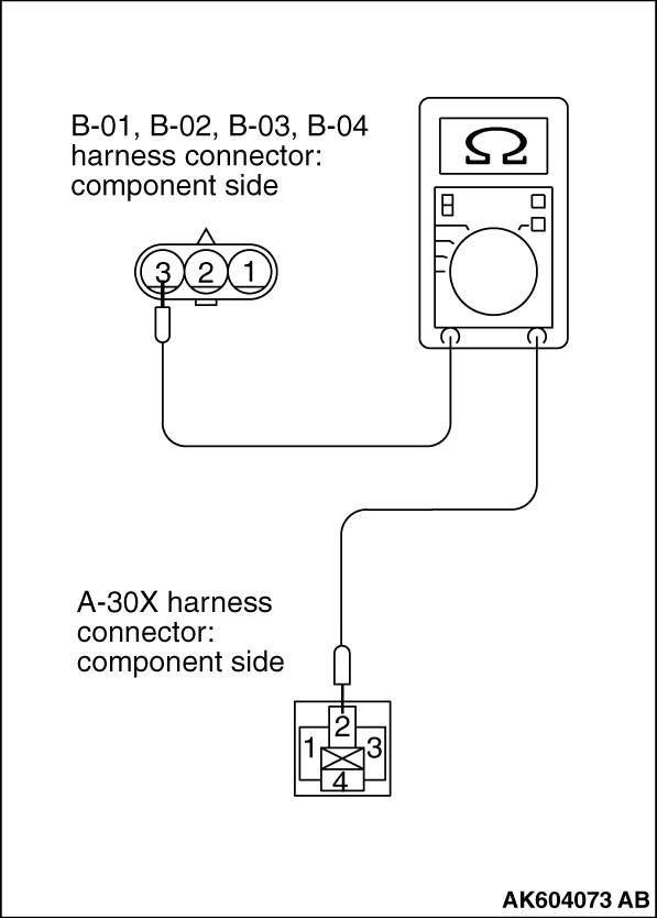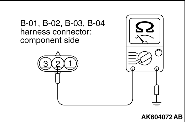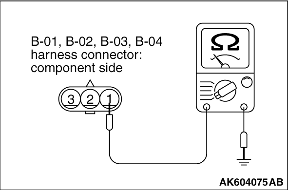 (1)Disconnect the connector B-01, B-02, B-03 and B-04 measure at the harness side. (2)Check for the continuity between terminal No. 1 and ground.