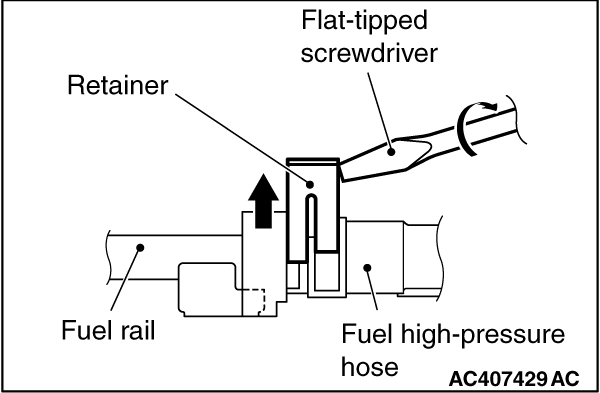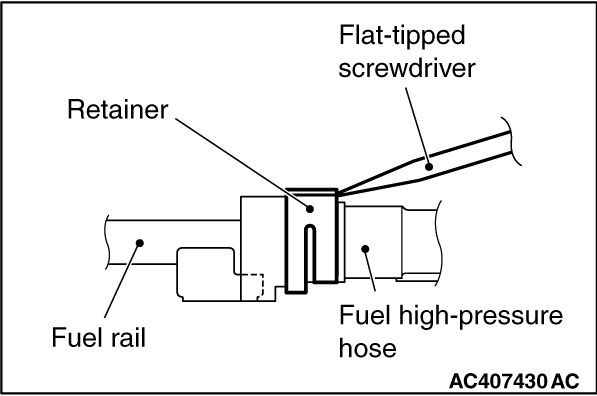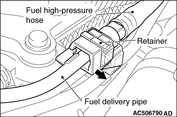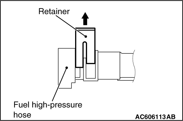up the retainer and unlock the fuel high-pressure hose connector. 2.Disconnect the fuel high-pressure hose.