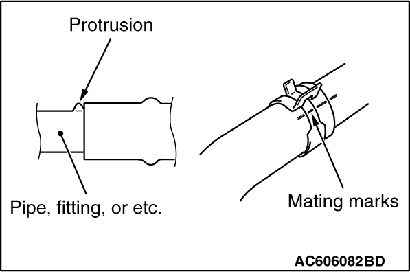 1.Insert radiator upper hose as far as the projection of the cooling water outlet hose fitting. 2.Align the mating marks on the radiator upper hose and hose clamp, and then connect