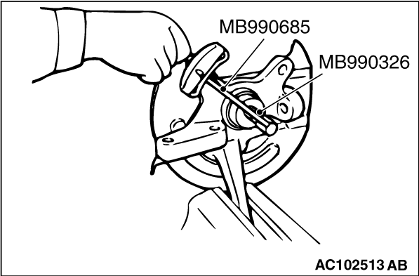 3.Use Special tools MB990326, MB990685 to measure the hub rotation starting torque. Limit: 1.5 N·m (13 in-lb) 4.Hub rotation starting torque should be within the limit value, and there should be no roughness and gritty feeling in rotation.