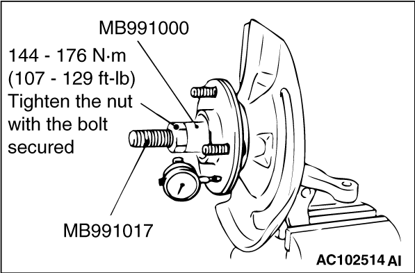 1.Use special tools MB991000 and MB991017 to measure to determine whether the wheel bearing end play is within the specified limit or not. Limit: 0.05 mm(0.002 inch) 2.If the end play is not within the limit range while the nut is tightened to the specified torque, the bearing, hub and/or knuckle have probably not been installed correctly. Replace the bearing and re-install. Tightening torque: 144 - 176 N·m (107 - 129 ft-lb)