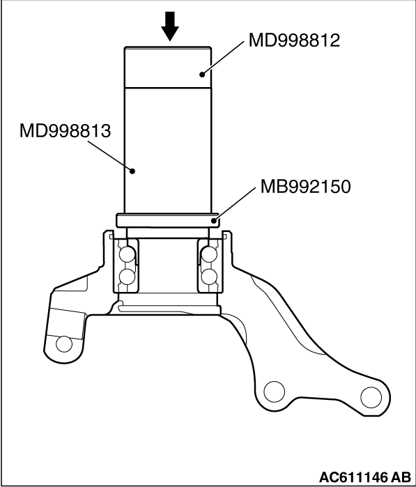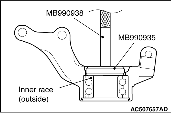 2.Use special tools MB992150, MD998812 and MD998813 to assemble the inner race (outside) removed from the hub to the wheel bearing.