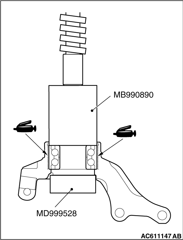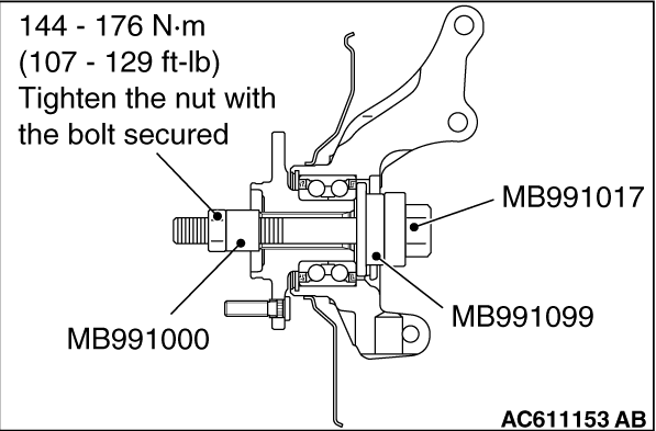 1.Set special tools MB991000, MB991017 and MB991099 as shown in the figure, tighten the nut to the specified torque, and press-fit the hub into the knuckle. Tightening torque: 144 - 176 N·m (107 - 129 ft-lb) 2.Rotate the hub to make the bearing well-greased.