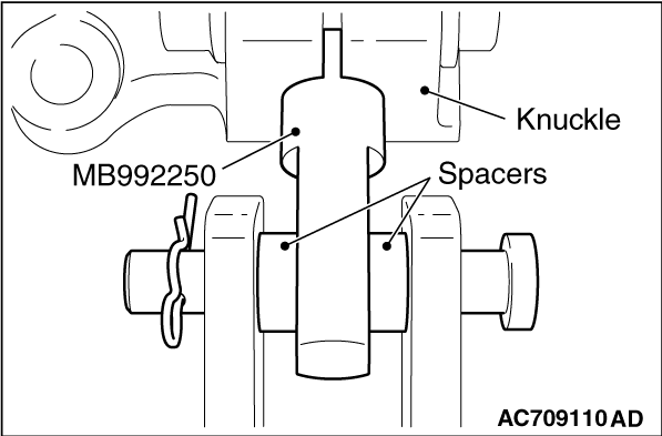 2.Insert special tool MB992250 in the knuckle and tighten it with a bolt and nut.
