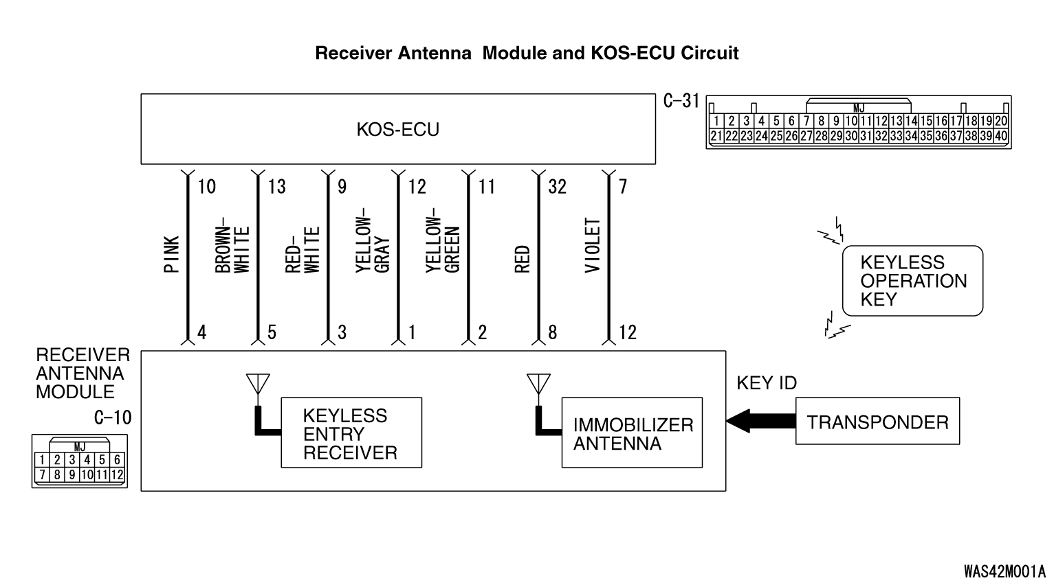 Is the receiver antenna module connector C-10 and KOS-ECU connector C-31 in good condition?