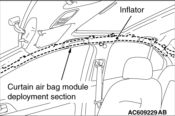 1.Check that the curtain air bag deployment part of the headlining is normal. 2.Check the inflator surface for cracks, dents or deformations. 3.Check the connector for damage, the terminal for deformation, and the harness for