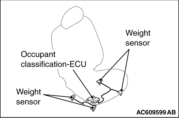 1.Check the occupant classification-ECU case and weight sensor for dents, cracks or deformation. 2.Check the connector for damage, and the terminals for deformation. 3.Check the installation of the occupant classification-ECU and weight sensor. 4.Check the diagnostic trouble code of the occupant classification-ECU and replace the