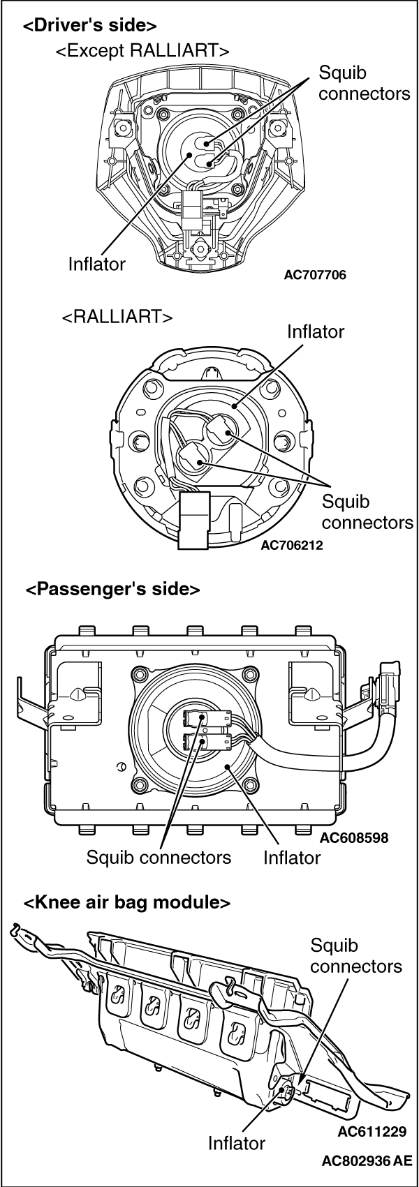 1.Check the pad cover for dents, cracks or deformation. 2.Check the connector for damage, terminal deformities, and the harness for binding. 3.Check the air bag inflator case for dents, cracks or deformities. 4.Install the air bag module (driver’s side) to the steering wheel to check