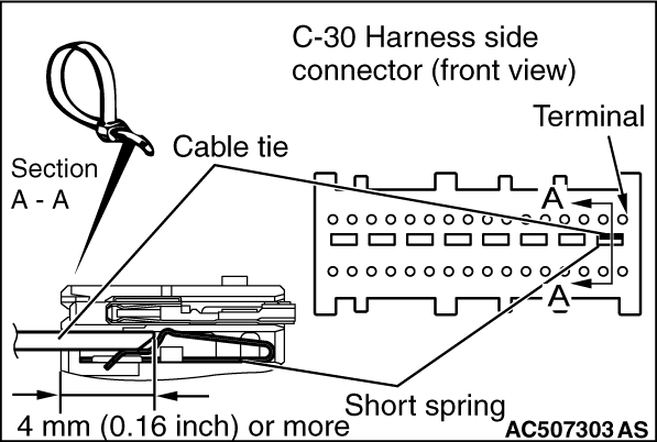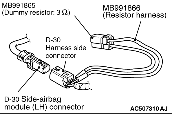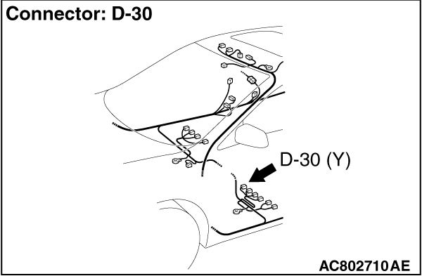 Insert special tool MB991866 into the D-30 harness side connector by backprobing. (5)Connect the negative battery terminal. (6)Erase diagnostic trouble code memory, and check the diagnostic trouble code.