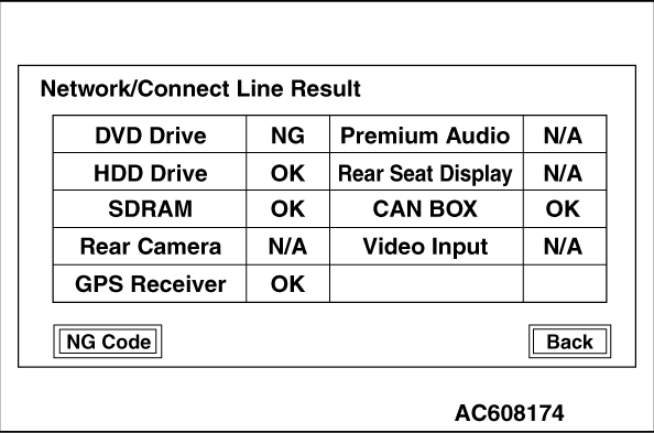 note If there is "NG" or "N/A" as the check results, select "NG Code" on the "Network/Connect Line Result" screen. Then "NG code Indication" screen will show the NG code.