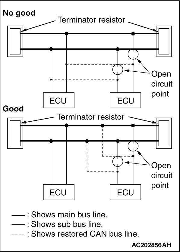 If one-side terminator resistor is broken, the CAN communication will continue although noise suppression is deteriorated. No diagnostic trouble code may be set even if the terminator resistor was broken. If a damage is found, replace the ECU which incorporates the defective terminator resistor.