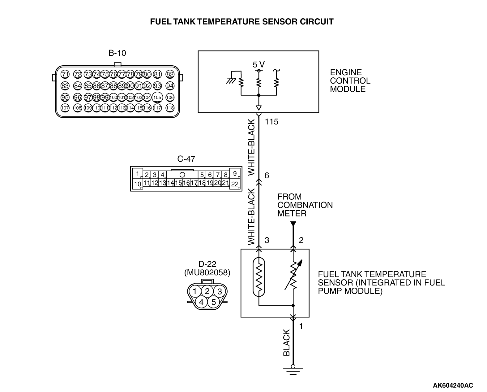 sensor connector D-22 (terminal No. 3) and ECM connector B-10 (terminal No. 115).
