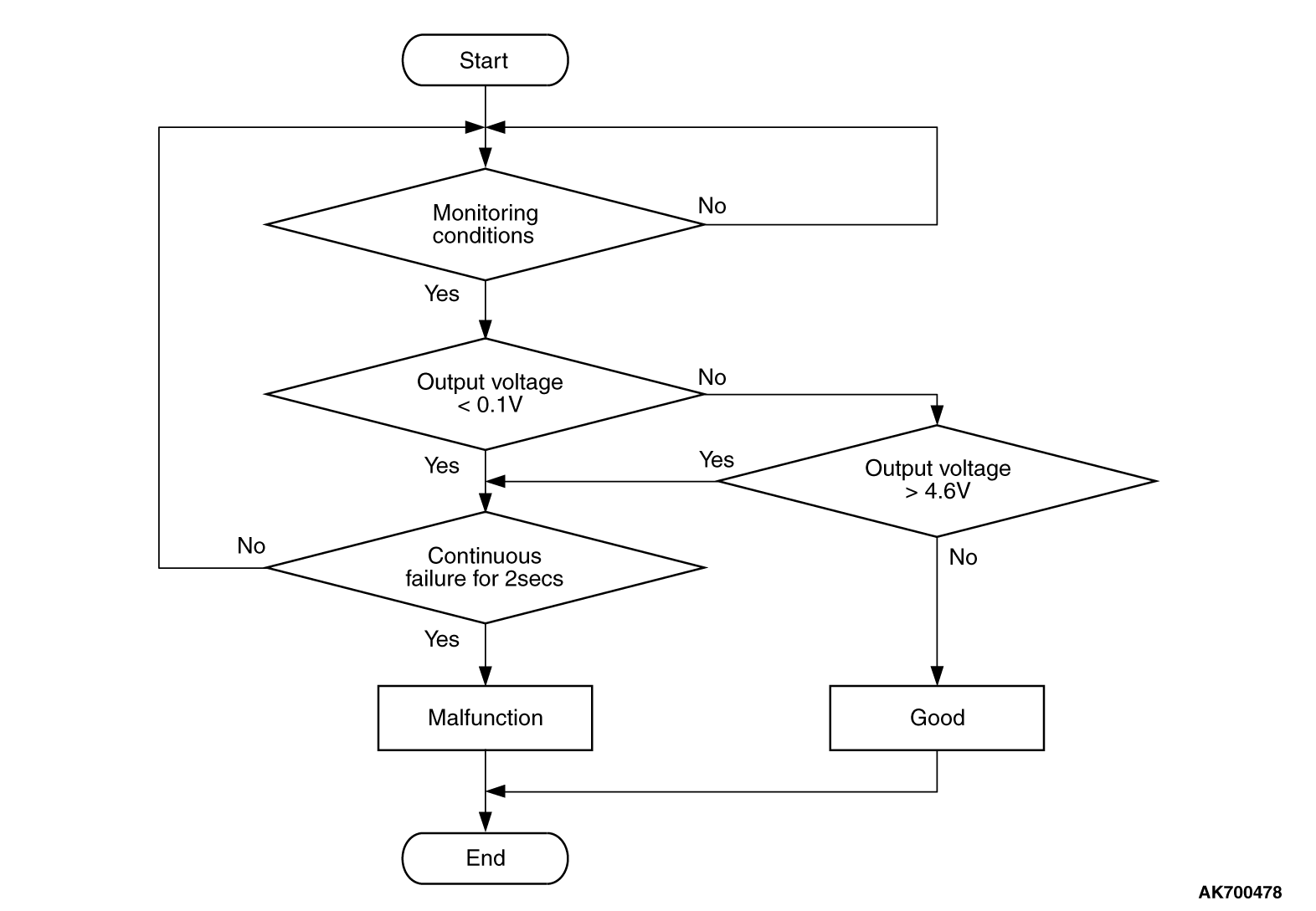- Sensor output voltage has continued to be 0.1 volt or lower for 2 seconds.