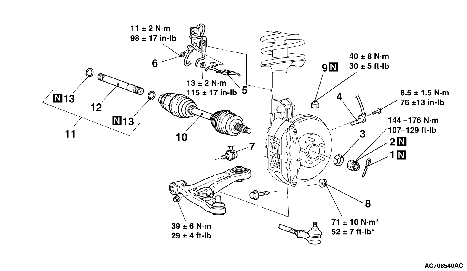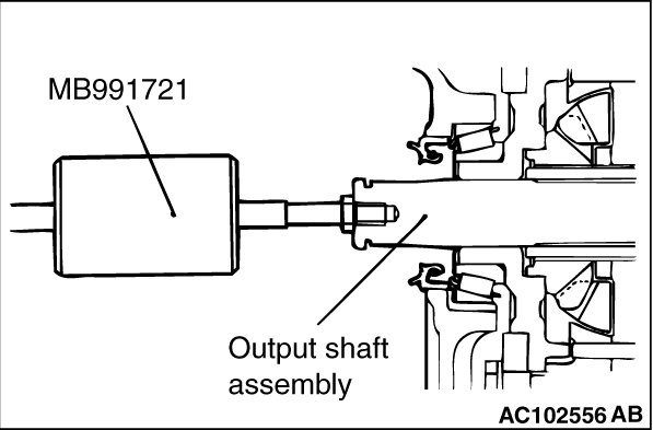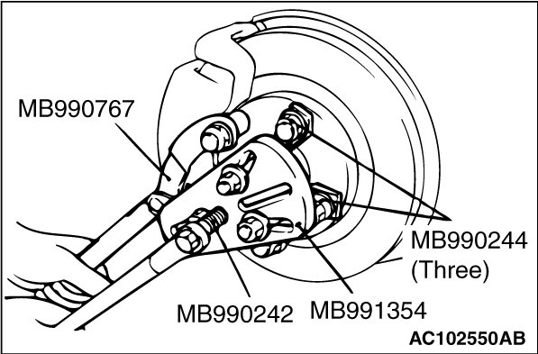 Do not apply the vehicle weight to the wheel bearing with the front driveshaft assembly removed. If, however, the vehicle weight shall be applied to the bearing (in order to move the vehicle), tighten the following special tools MB991000 and MB990998 to the specified torque 144 - 176 N·m (107 - 129 ft-lb).