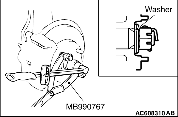 1.Be sure to install the front driveshaft washer in the illustrated direction. 2.Using special tool MB990767, tighten the driveshaft nut. At this time, tighten the nut to the specified lower limit torque so that the pin hole may align with cotter pin. Tightening torque: 144 - 176 N·m (107 - 129 ft-lb) 3.If the pin hole does not align with the pin, tighten the driveshaft nut [less than 176 N·m (129 ft-lb)] and find the nearest hole, then fit the cotter pin.