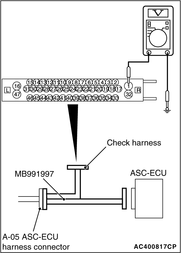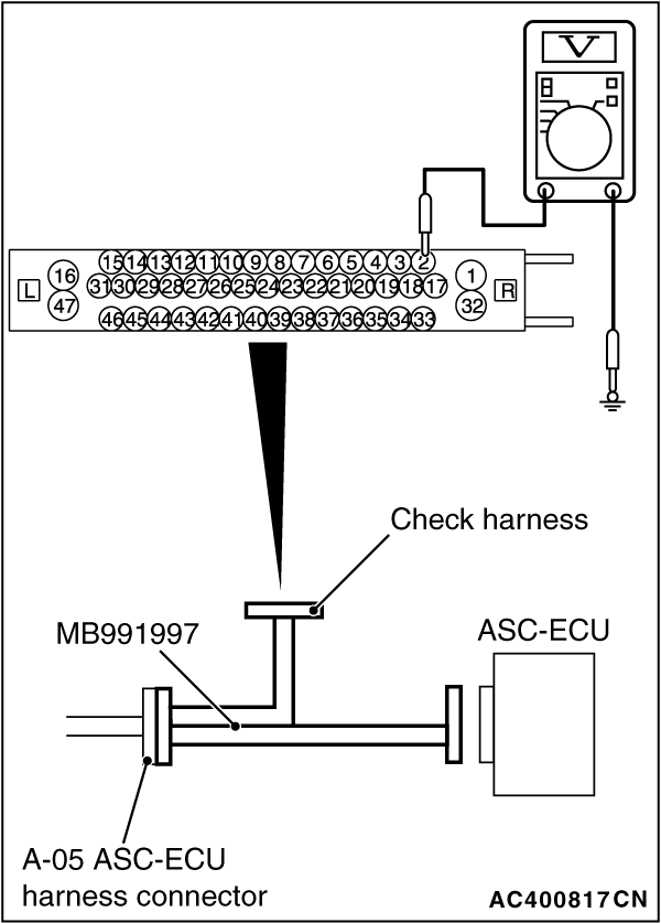 (1)Disconnect the connector, connect the ASC check harness (Special tool: MB991997) to the wiring harness-side connector, and measure the voltage at the special tool connector side.