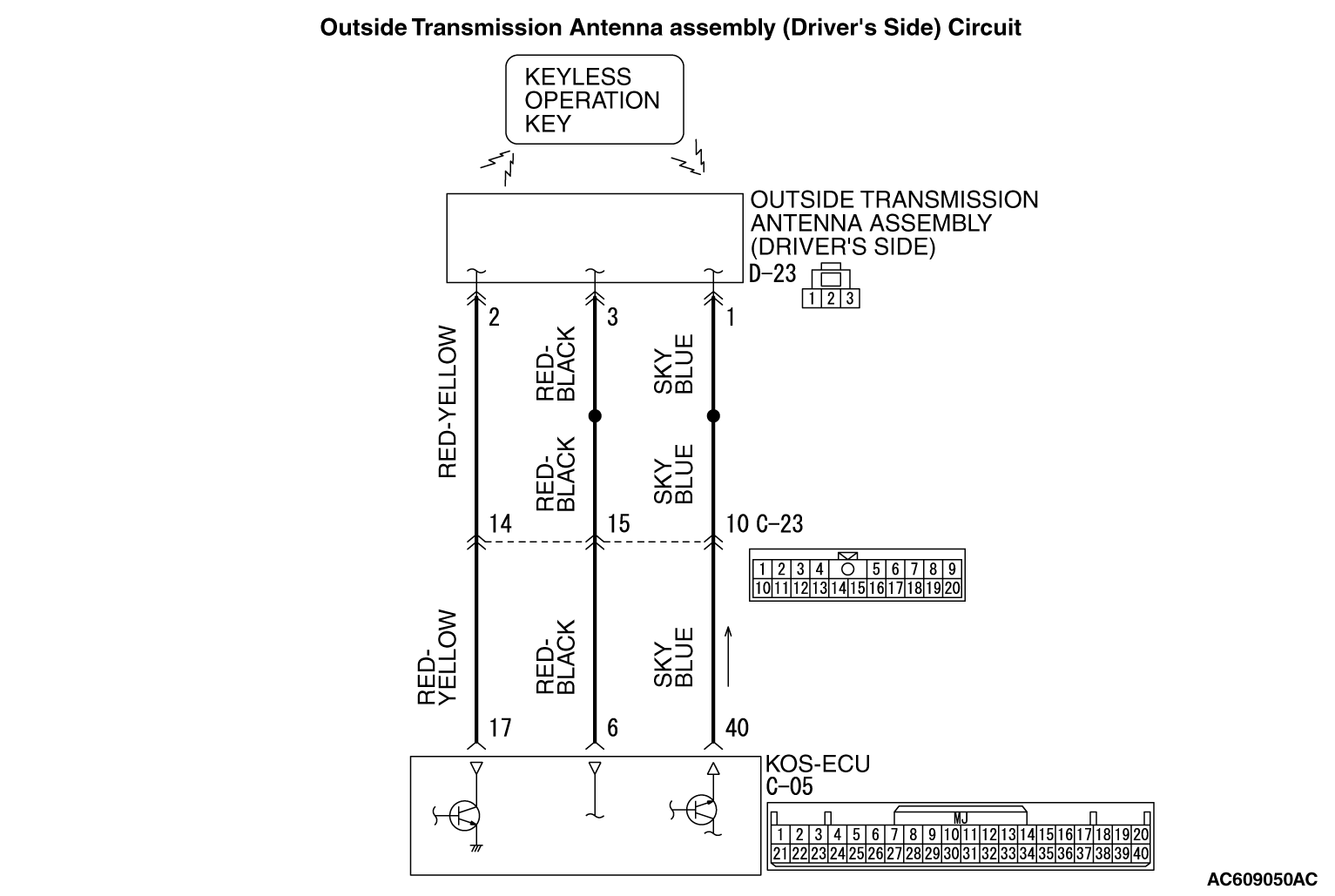 Are the wiring harness between KOS-ECU connector C-05 (terminal Nos. 6, 17, 40) and outside transmission antenna assembly (driver’s side) connector D-23 (terminal Nos. 3, 2, 1) in good condition?