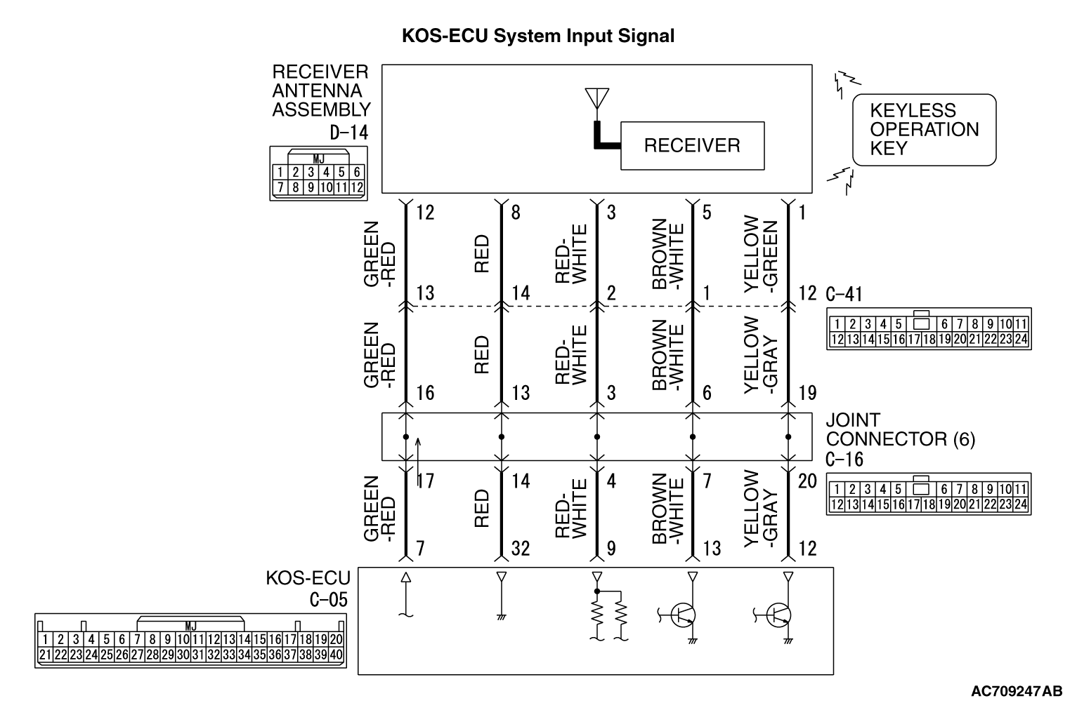 Q. Are the wiring harness between KOS-ECU connector C-05 (terminal Nos. 7, 9, 12, 13 and 32) and receiver antenna assembly connector D-14 (terminal Nos. 12, 3, 1, 5 and 8) in good condition?