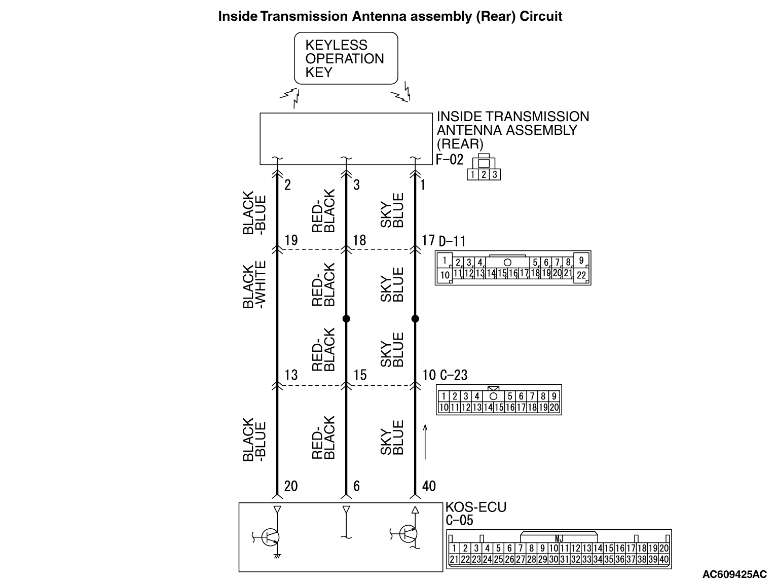 Repair or replace the damaged component(s). Refer to GROUP 00E, Harness Connector Inspection . Check that the inside transmission antenna assembly (rear) works normally.
