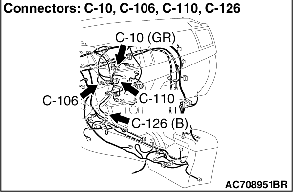 STEP 3. Check multivision display connector C-10 and audio and video adaptor connector C-126 for loose, corroded or damaged terminals, or terminals pushed back in the connector. |