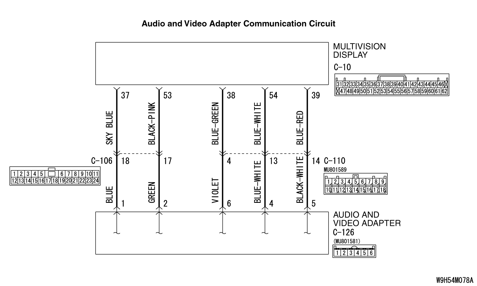 STEP 4. Check the wiring harness between multivision display connector C-10 (terminal 37, 53, 38, 54, 39) and audio and video adaptor connector C-126 (terminal 1, 2, 6, 4, 5). |