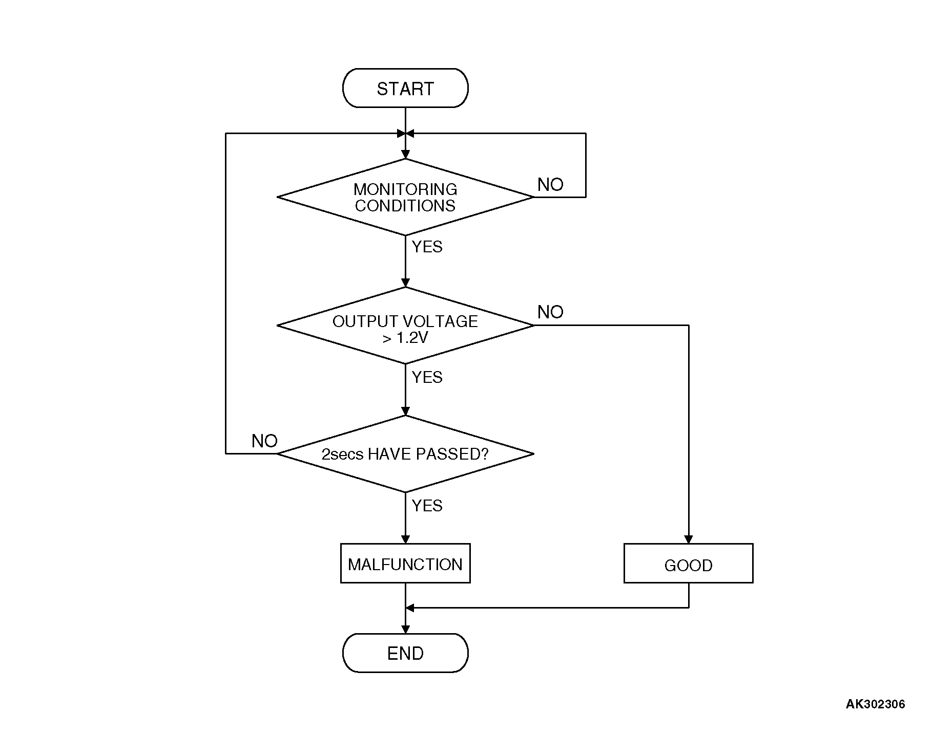 • If the heated oxygen sensor (front) output is higher than the standard value while monitoring the heated oxygen sensor (front) output, a short circuit (short circuit to power supply) is determined to have occurred. MONITOR EXECUTION