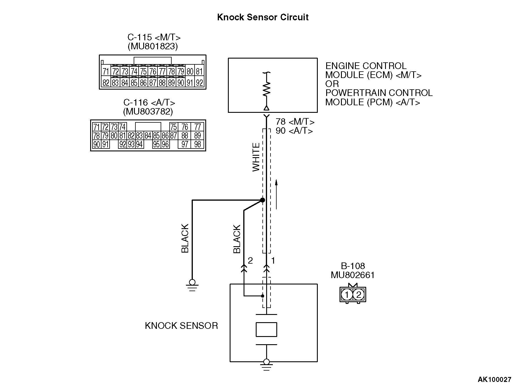 • The knock sensor sends a signal voltage to the ECM (terminal No. 78) <M/T> or PCM (terminal No. 90) <A/T>.