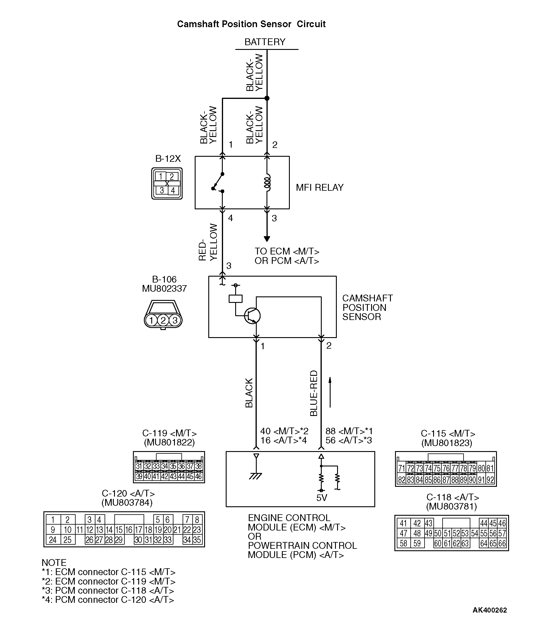 • The camshaft position sensor power is supplied from the MFI relay (terminal No. 4).