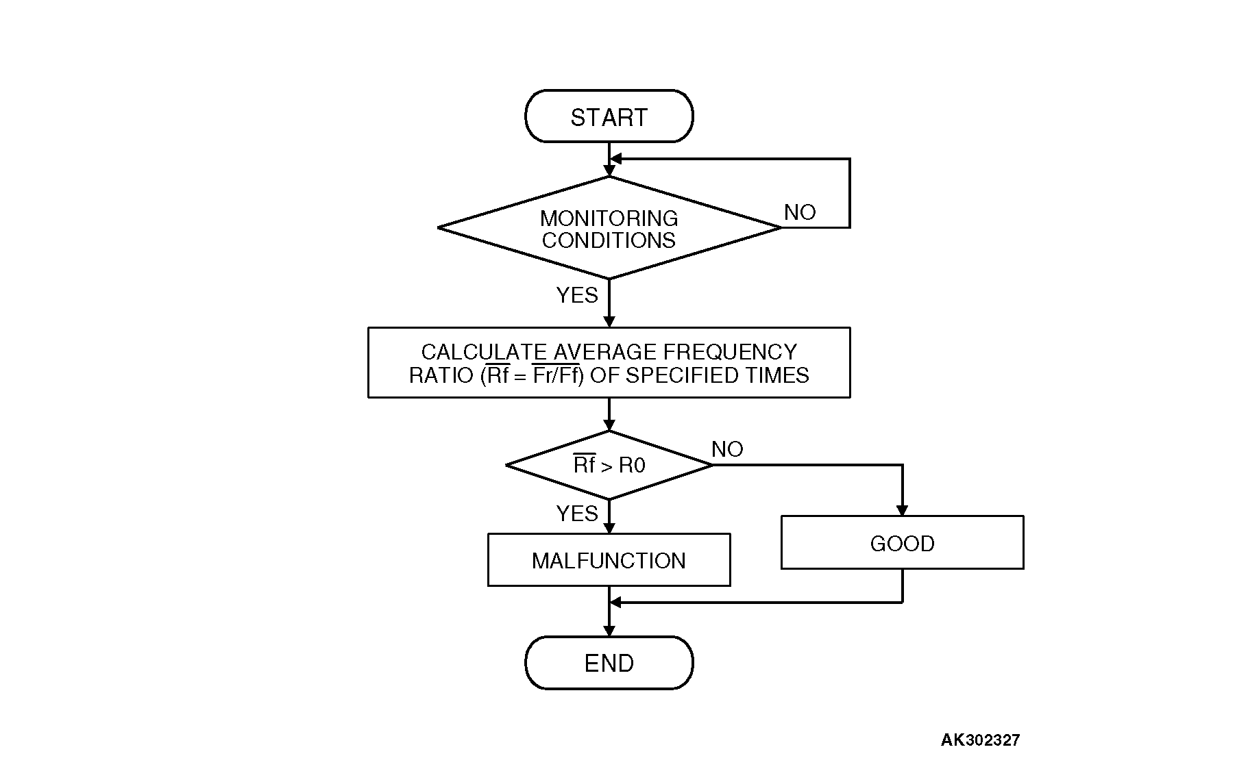 • If the inversion frequency is found to be equal through a comparison of the lean/rich inversion frequency of the heated oxygen sensor (front), the catalyst is determined to have deteriorated.