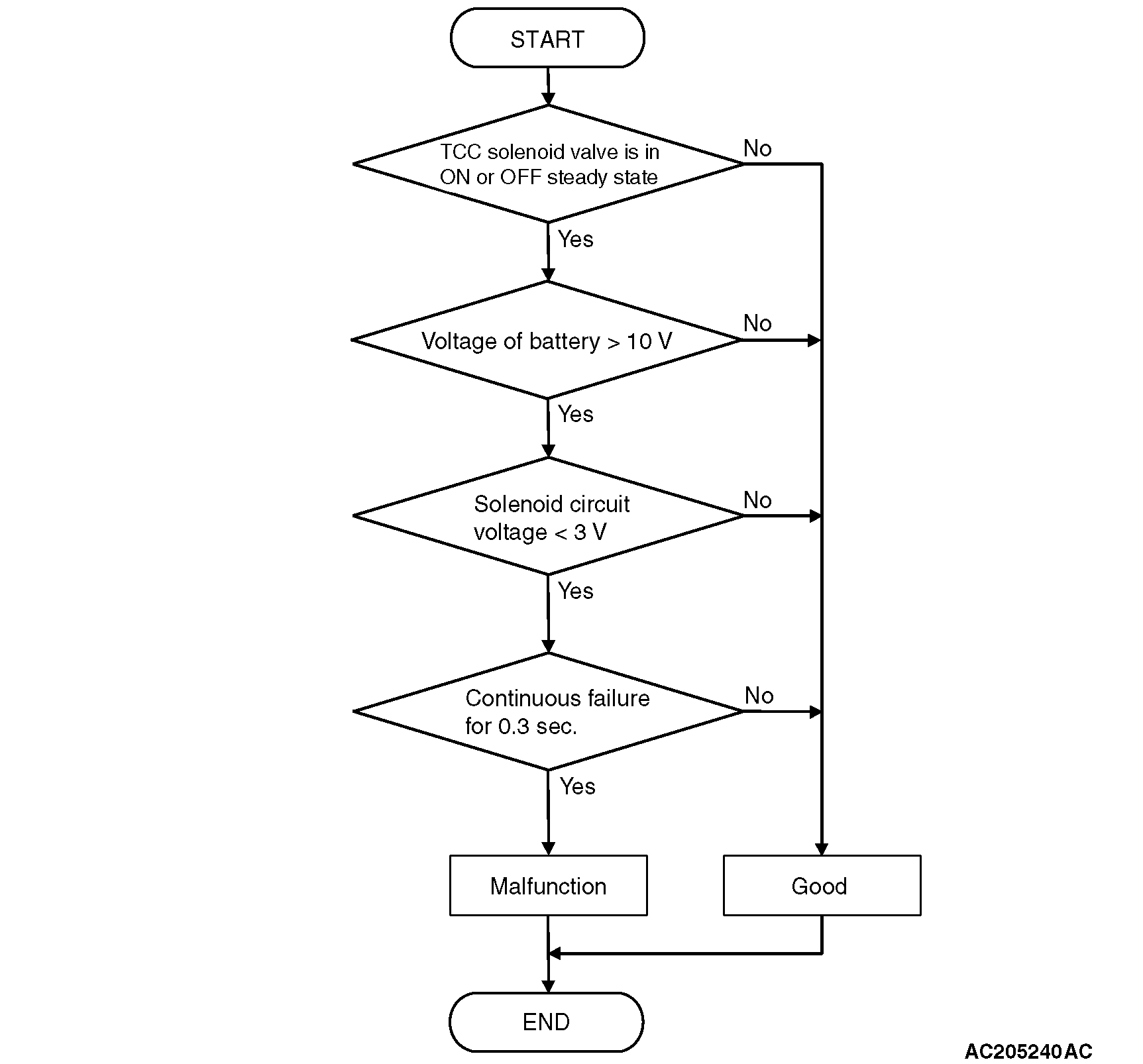 If lock-up is not engaged, and solenoid terminal voltage is below specified value, PCM judges that torque converter clutch solenoid valve has a failure.