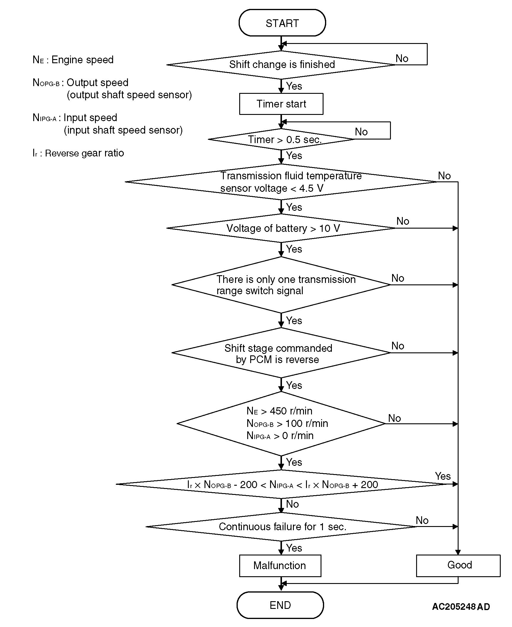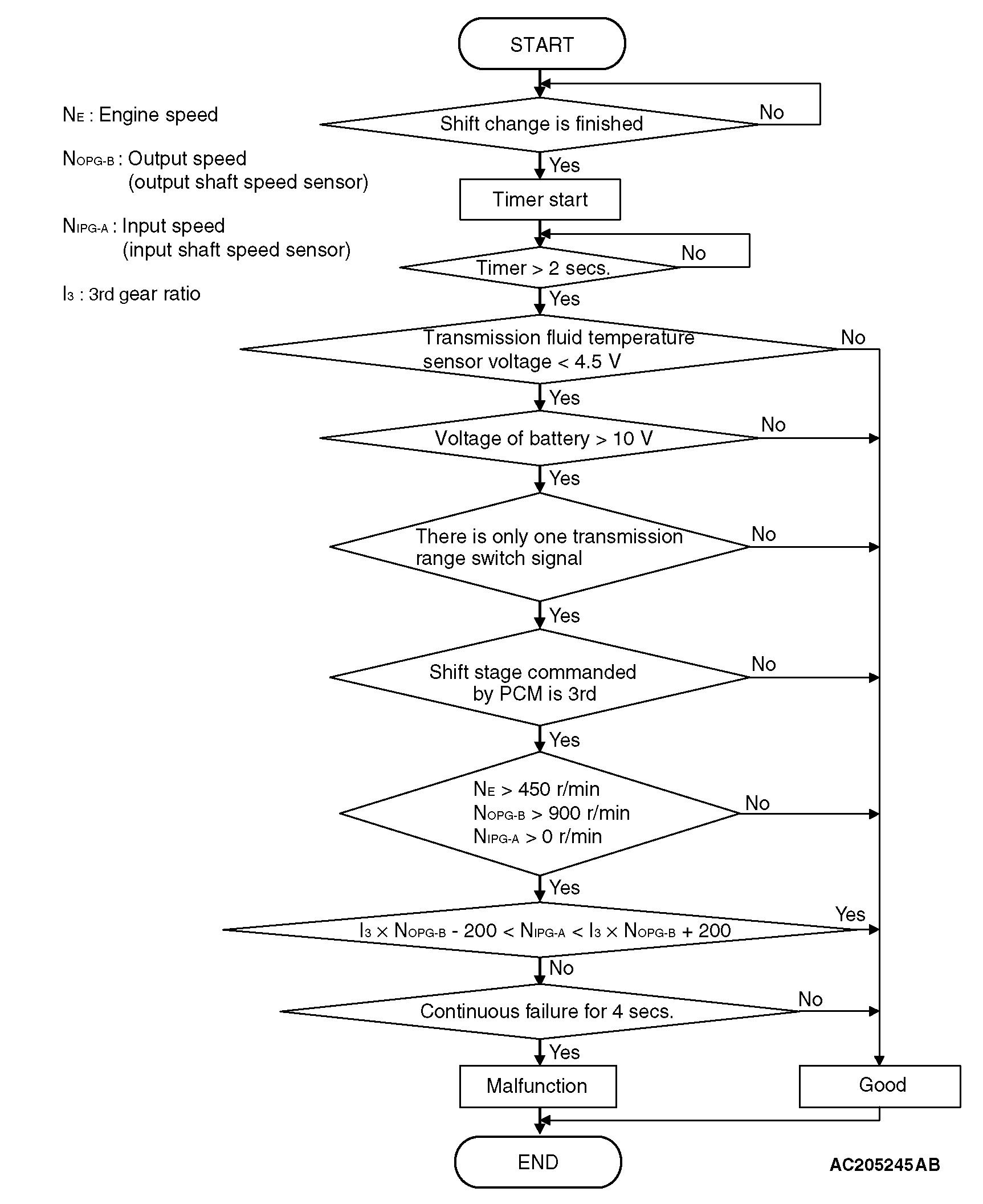 • A/T control relay LOGIC FLOW CHARTS (Monitor Sequence) <DTC 43 (P0733)> DTC SET CONDITIONS <DTC 43 (P0733)>