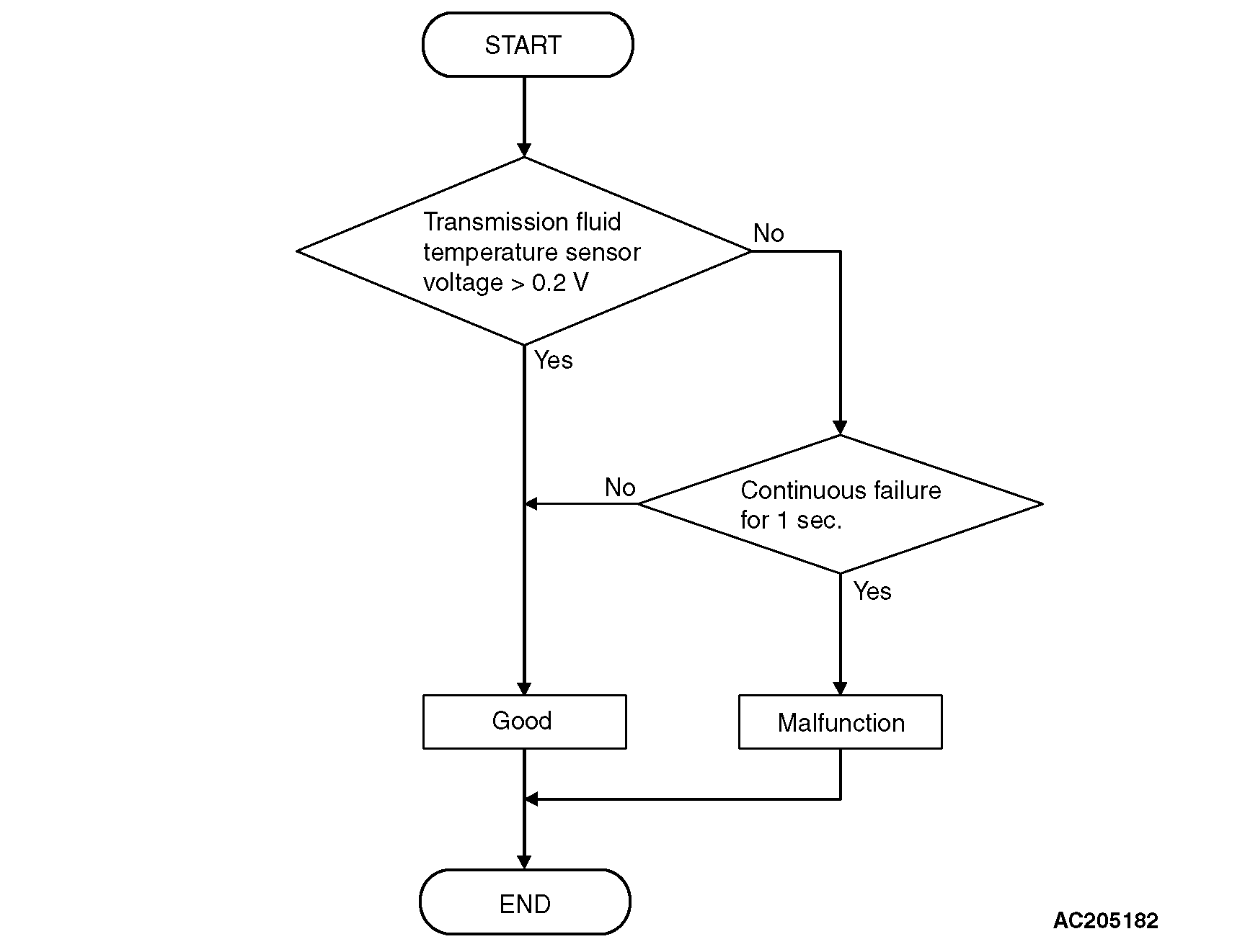 If transmission fluid temperature equals or exceeds specified value, PCM judges that transmission fluid temperature sensor has a failure.