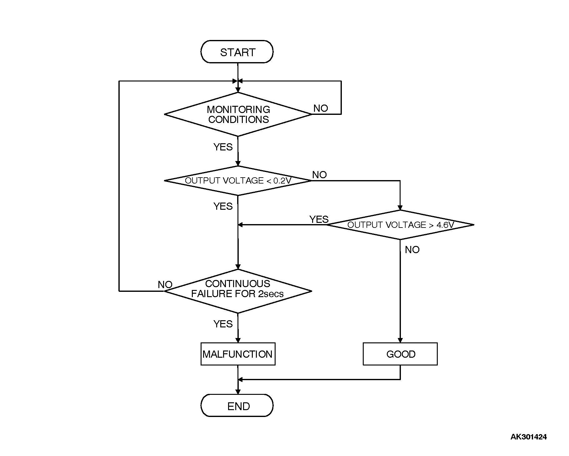 • Intake air temperature sensor output voltage has continued to be 4.6 volts or higher [corresponding to an air intake temperature of -40°C (-40°F) or lower] for 2 seconds.