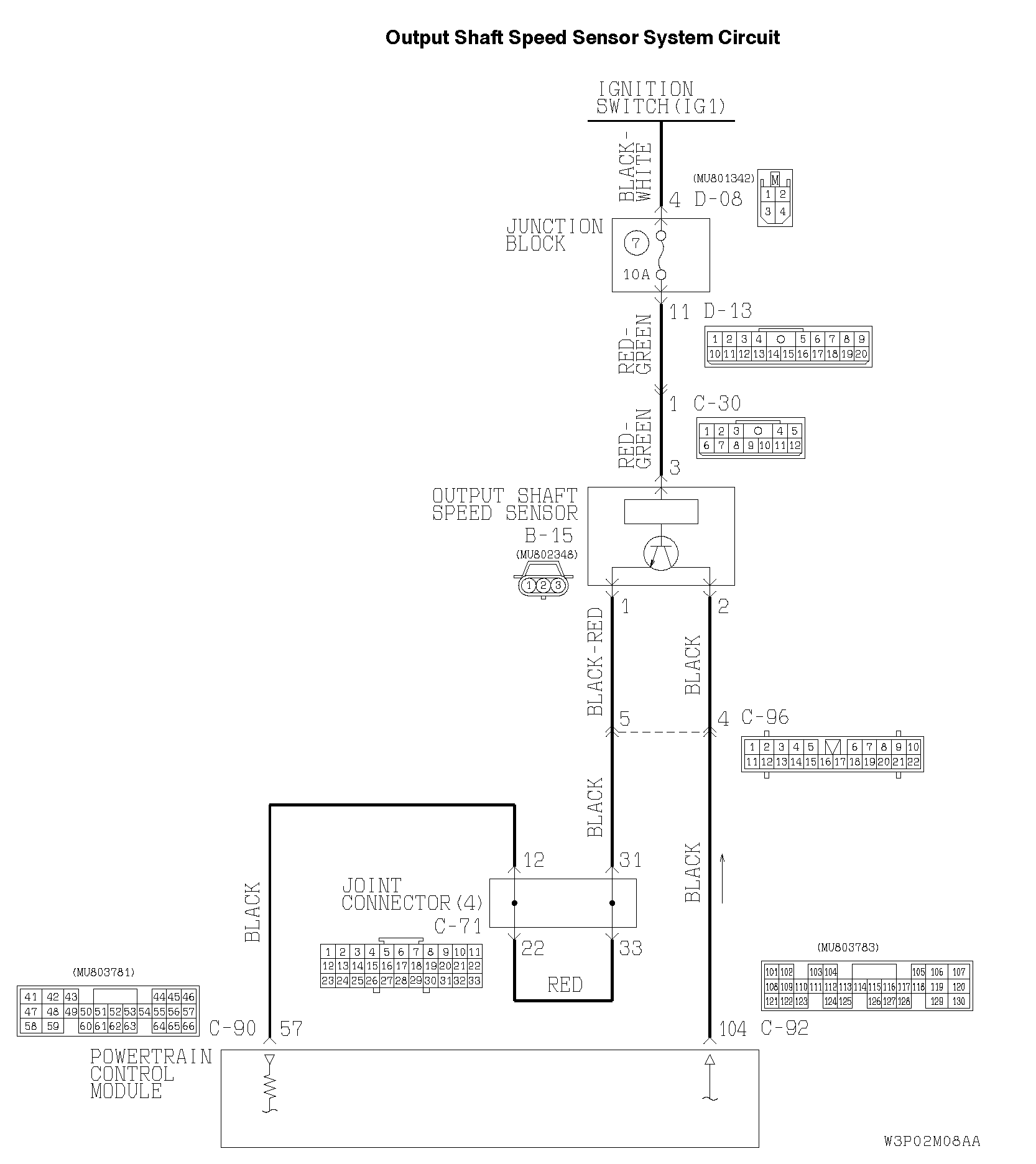 The PCM detects the output shaft speed by the signal input to terminal 104.