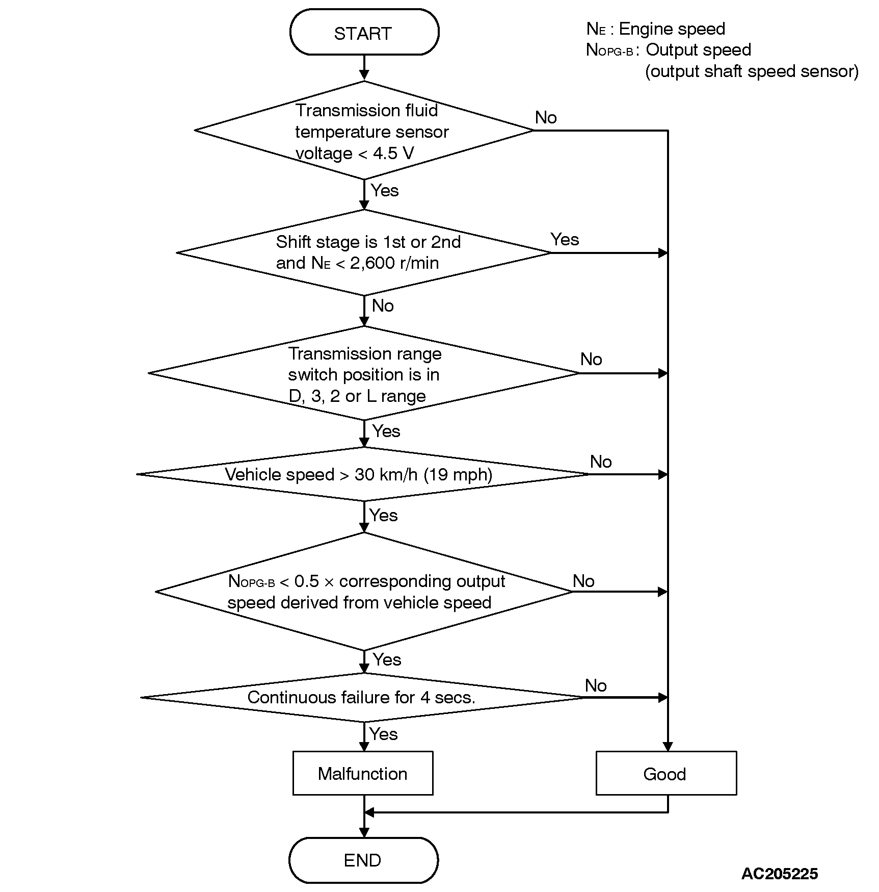 During driving test at more than specified speed, if vehicle speed calculated from output revolution is below half of vehicle speed from vehicle speed sensor, PCM judges that output shaft speed sensor circuit is open. MONITOR EXECUTION