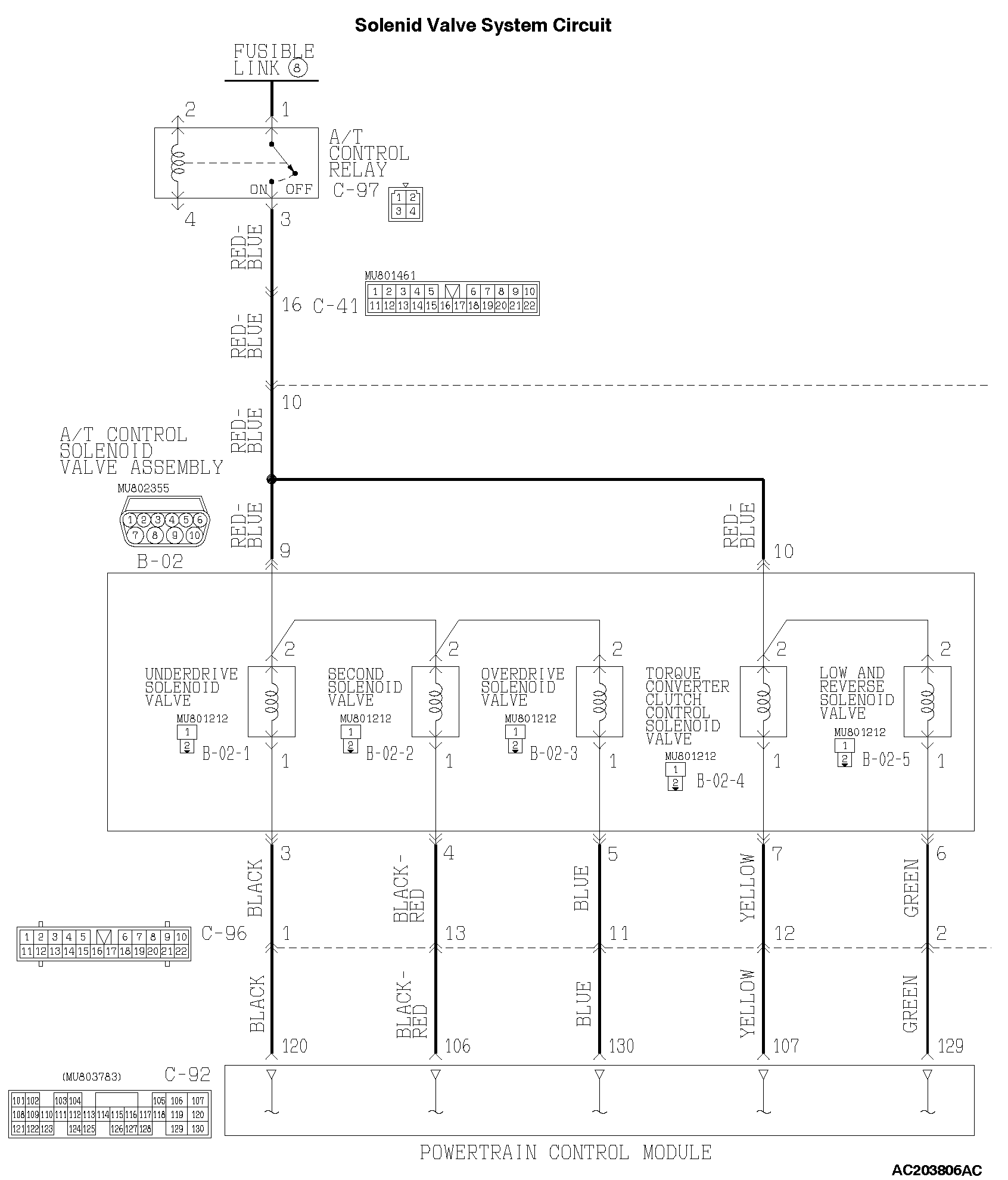The A/T control relay supplies battery positive voltage to the solenoid valve assembly (terminals 9 and 10).