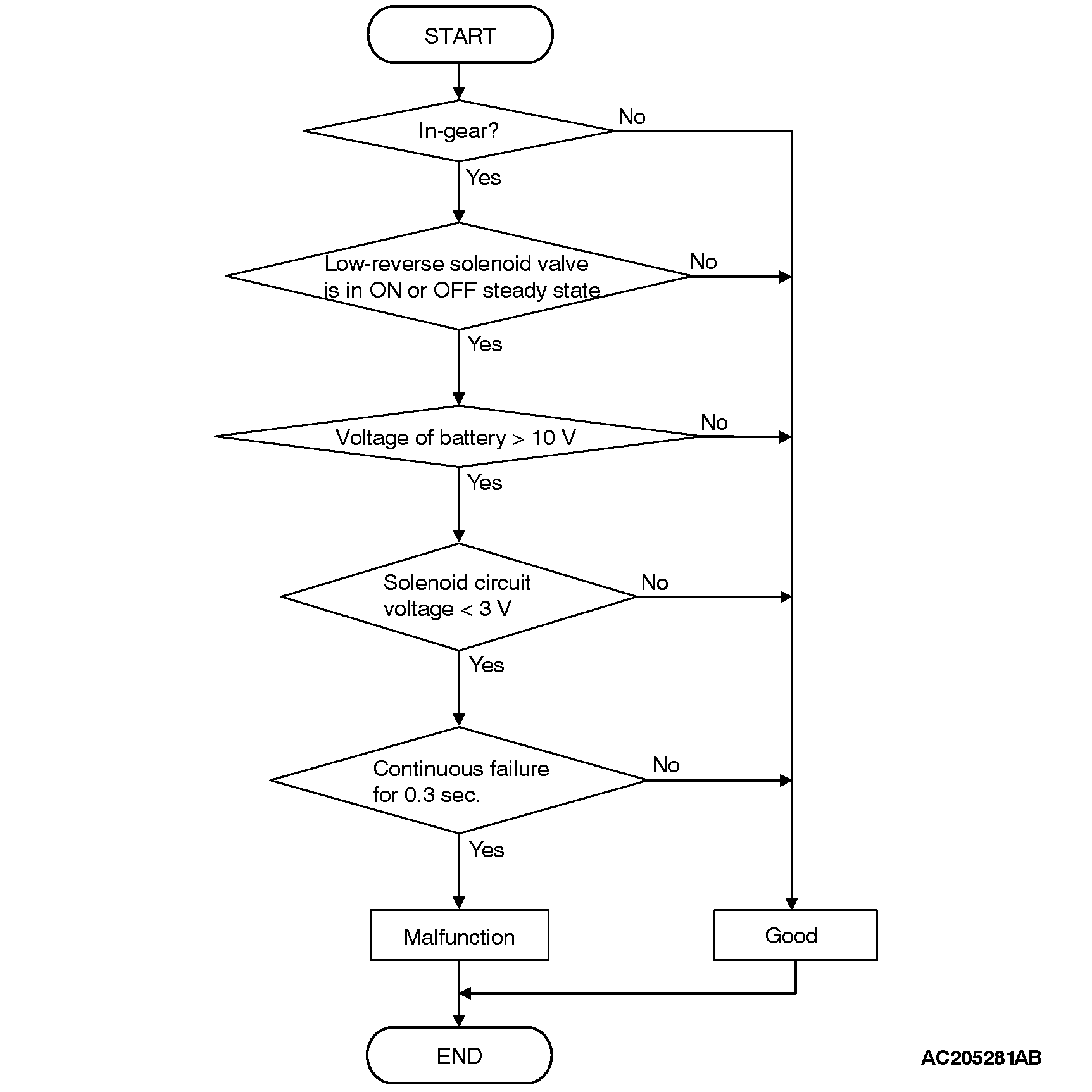 If solenoid terminal voltage is below specified value when shift control is not in progress, PCM judges that low-reverse solenoid has a failure. MONITOR EXECUTION