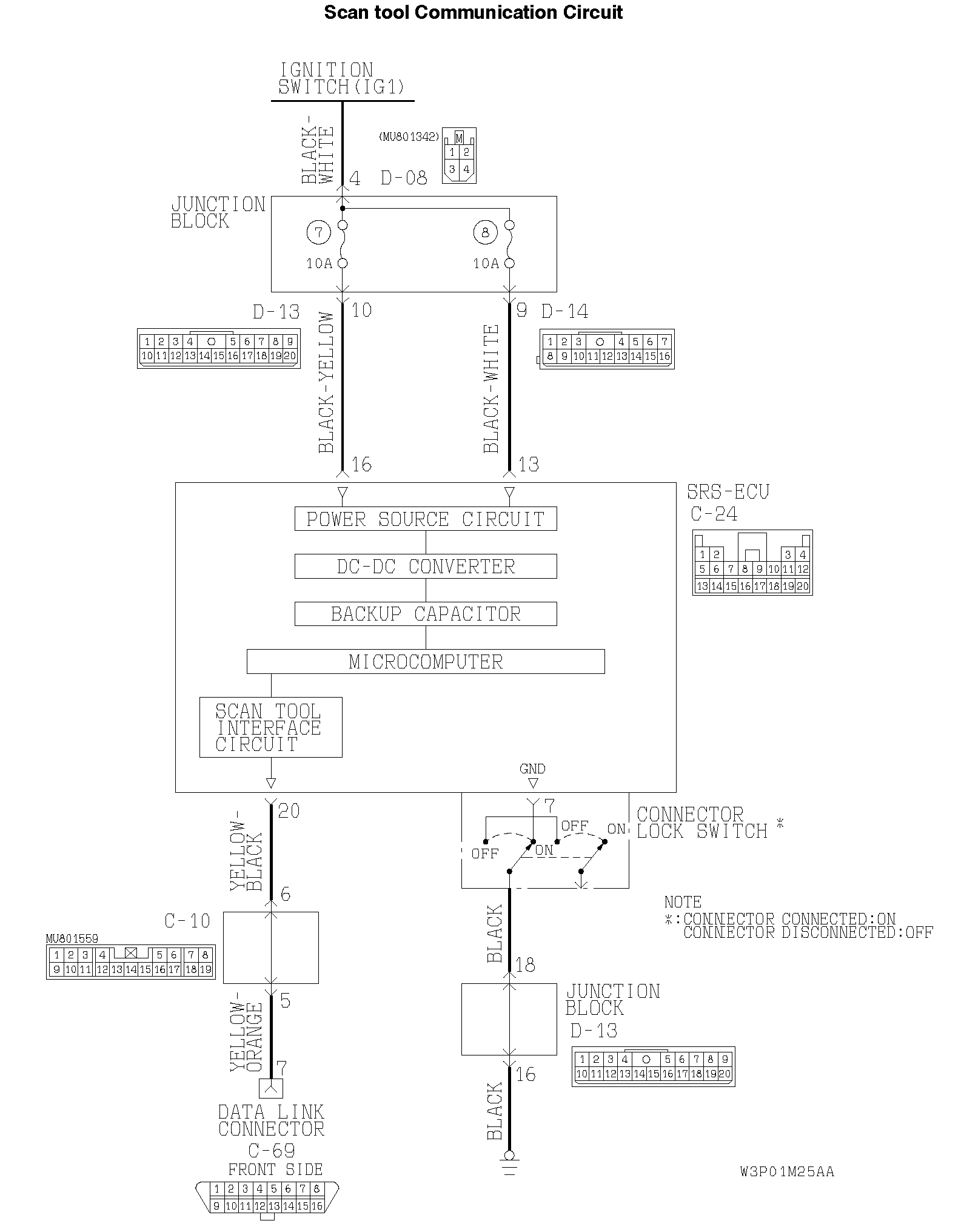 The SRS system diagnosis can be done by connecting scan tool MB991502 to the data link connector.