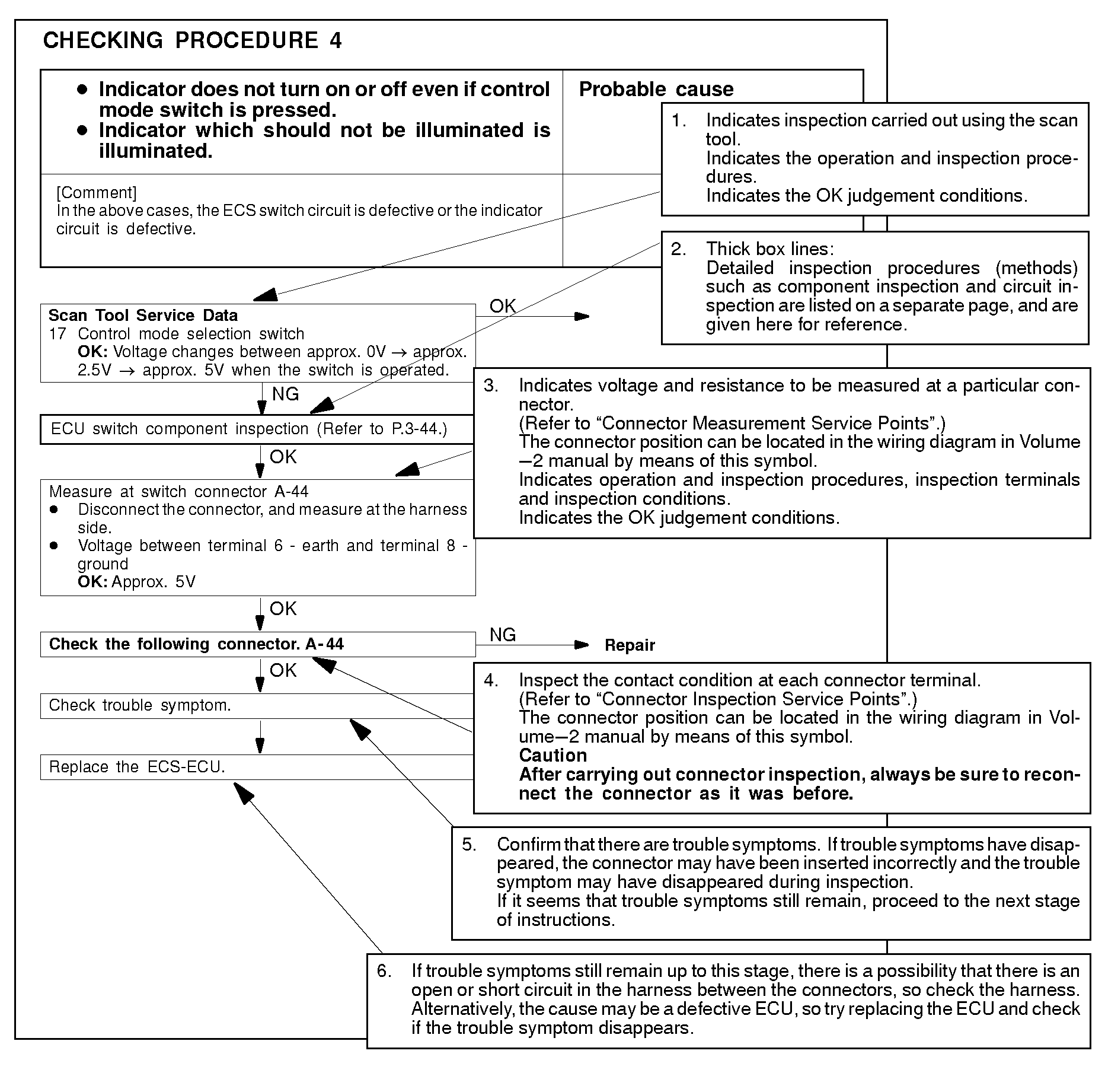The causes of a high frequency of problems occurring in electronic circuitry are generally the connectors, components, the ECU and the harnesses between connectors, in that order. These inspection procedures follow this order, and they first try to discover a problem with a connector or a defective component.