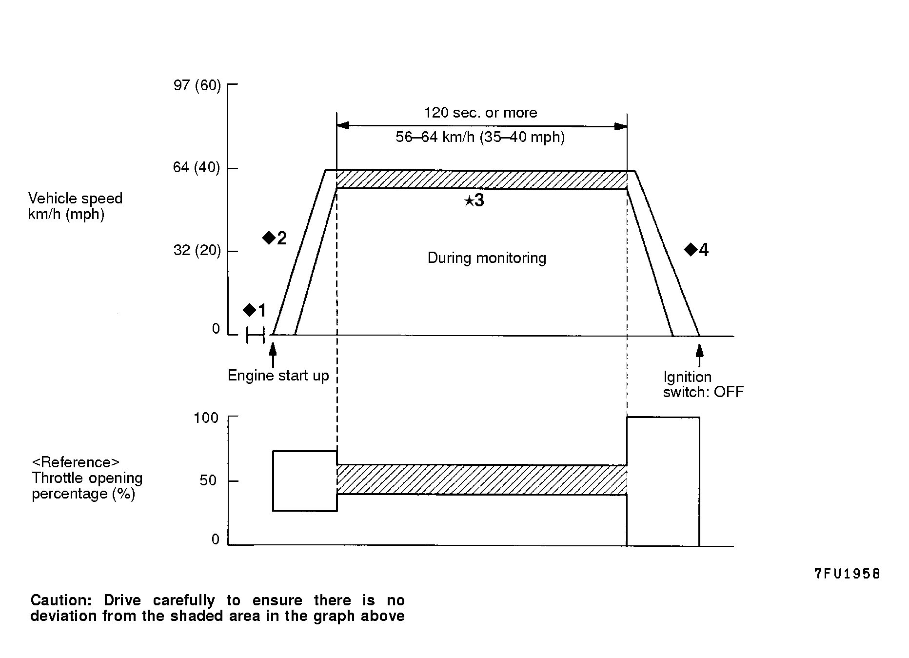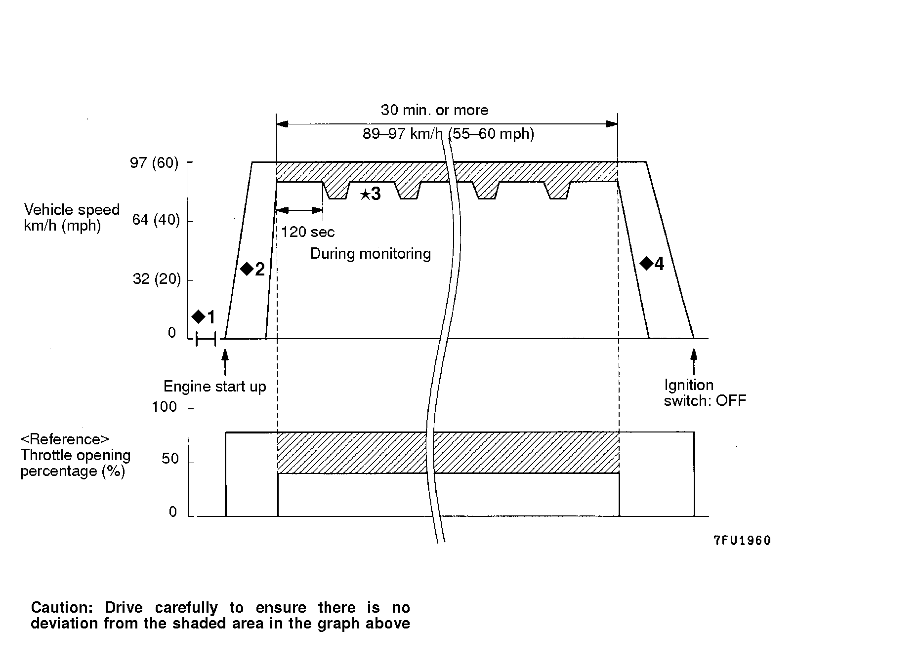 *: Monitoring period: Keep throttle open at a uniform level (minimize throttle variation) and drive for 90 seconds or more at 56 to 64 km/h (35 - 40 mph).