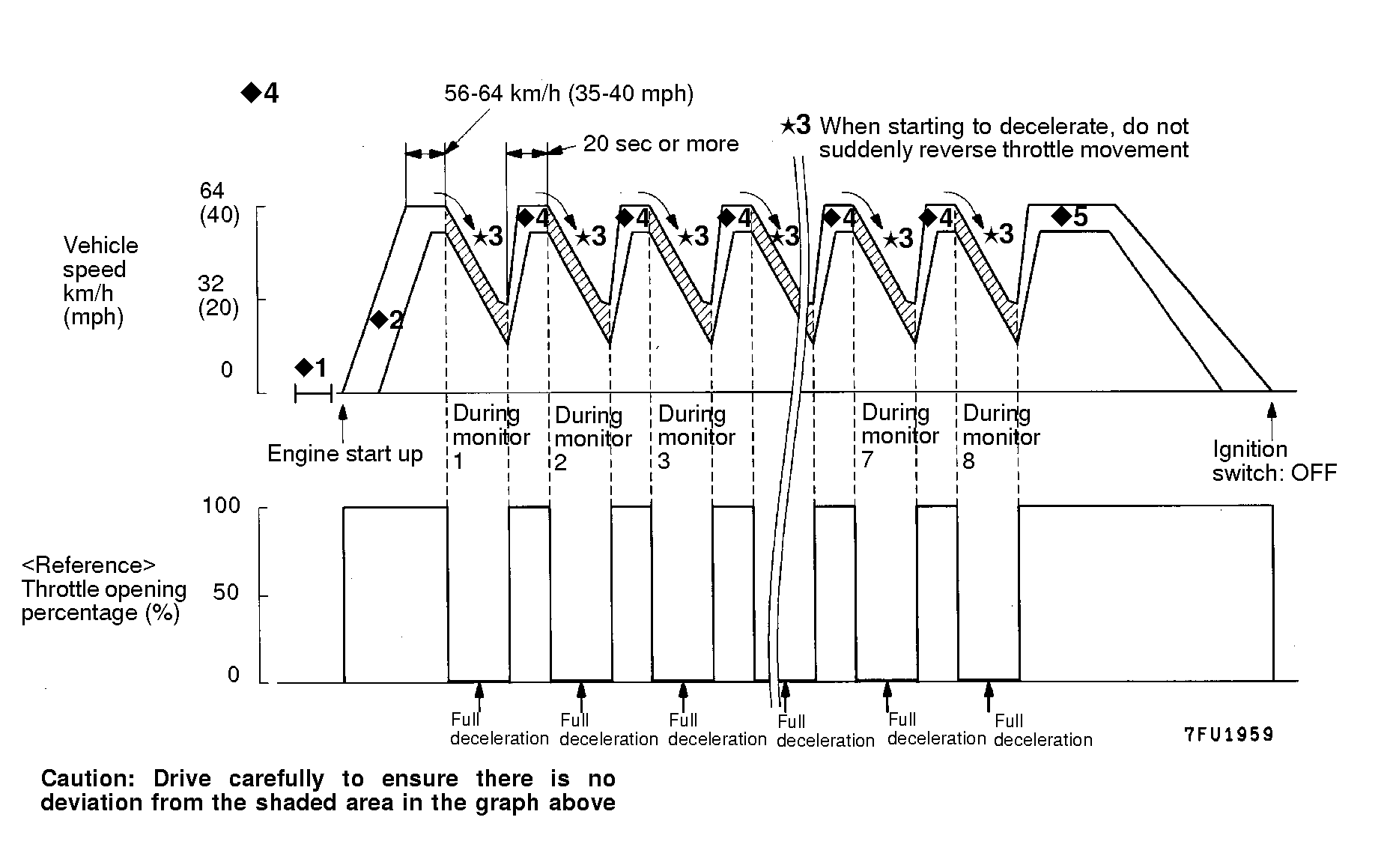 ♦: Fully close the throttle and decelerate (it is permissible to brake during this period). After maintaining deceleration for 10 seconds, accelerate quickly until speed reaches 56 to 64 km/h (35 - 40 mph). Subsequently, repeat steps *4 and ♦5 six times. (Ensure that steps *4 and ♦5 have been fully completed a total of six times.)