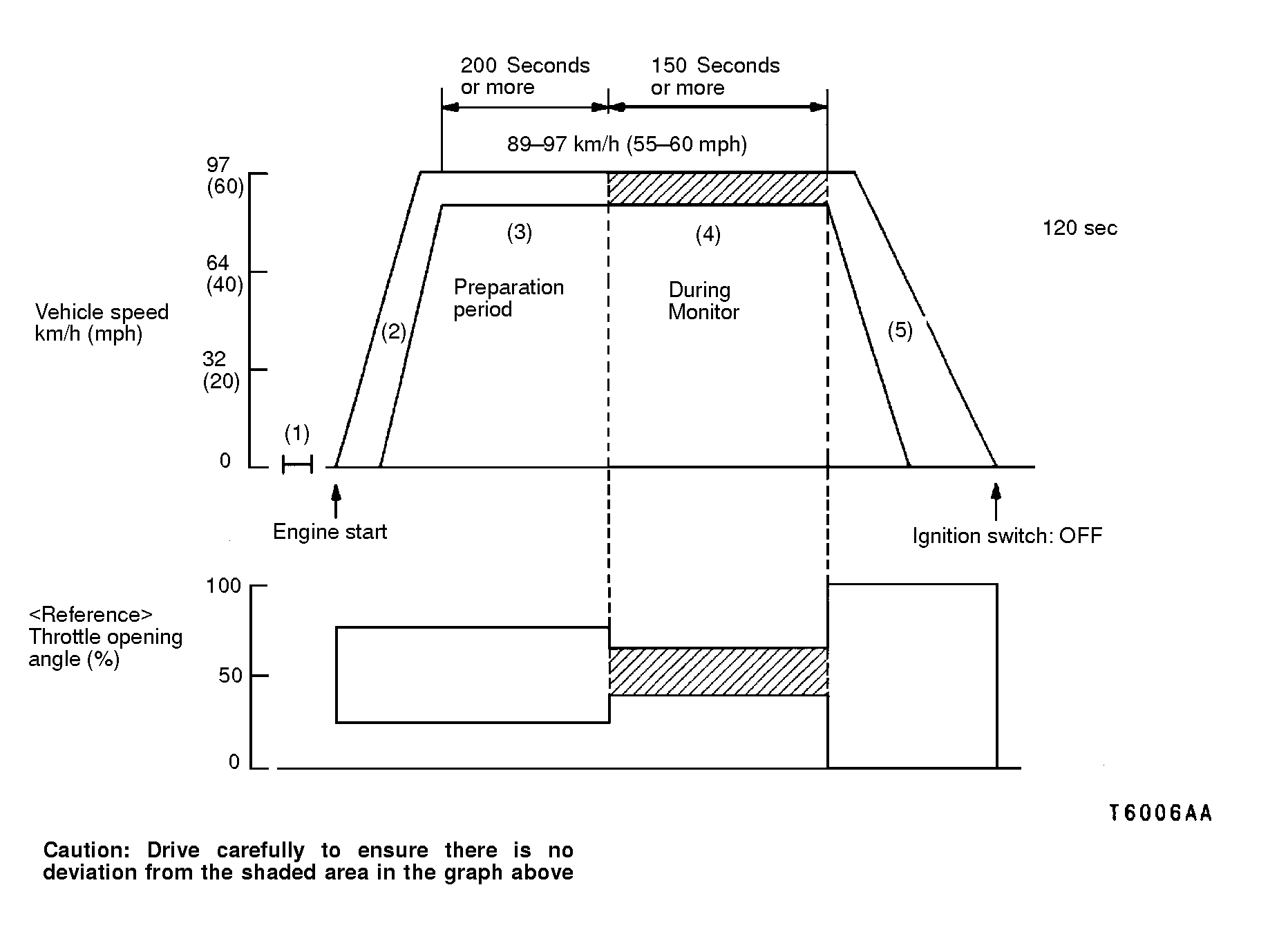 (3)Monitor preparation period: Drive for 200 seconds or more while maintaining vehicle speed between 89 - 97 km/h (55 - 60 mph).