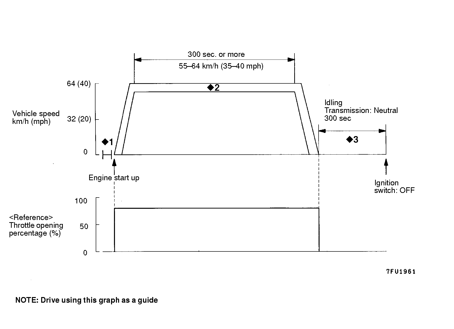 2.The following drive pattern (from start up to when the ignition is turned off) completes one trip monitor (Time required is approximately 35 minutes.)