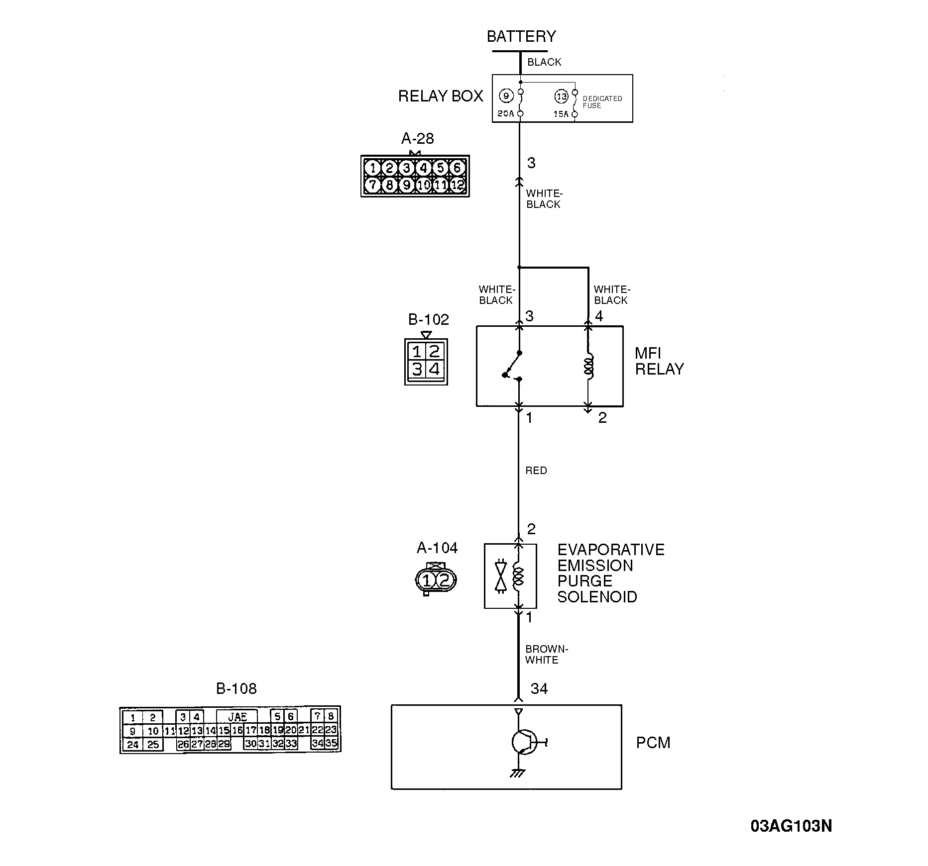 | STEP 4. Check the 12-volt supply circuit voltage at PCM connector B-108. (1)Do not disconnect PCM connector B-108. (2)Turn the ignition switch to "ON" position. (3)Measure the voltage between terminal 34 and ground by backprobing. •Voltage should be battery positive voltage. (4)Turn the ignition switch to "LOCK" (OFF) position. If battery positive voltage, go to Step 5. If not battery positive voltage, check connector A-104, B-108 and repair or replace as required. Refer to GROUP 00E, Harness Connector Inspection. If connector A-104, B-108 is in good condition, check the harness between evaporative emission purge solenoid connector A-104 and PCM connector B-108 for open circuit or damage. Then repair if necessary. Then go to Step 12. |