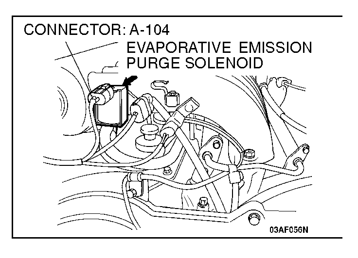 | STEP 6. Check evaporative emission purge solenoid connector A-104 for damage. If harness connector A-104 is in good condition, go to Step 7. If harness connector A-104 is damaged, repair or replace it. Refer to GROUP 00E, Harness Connector Inspection. Then go to Step 12. |